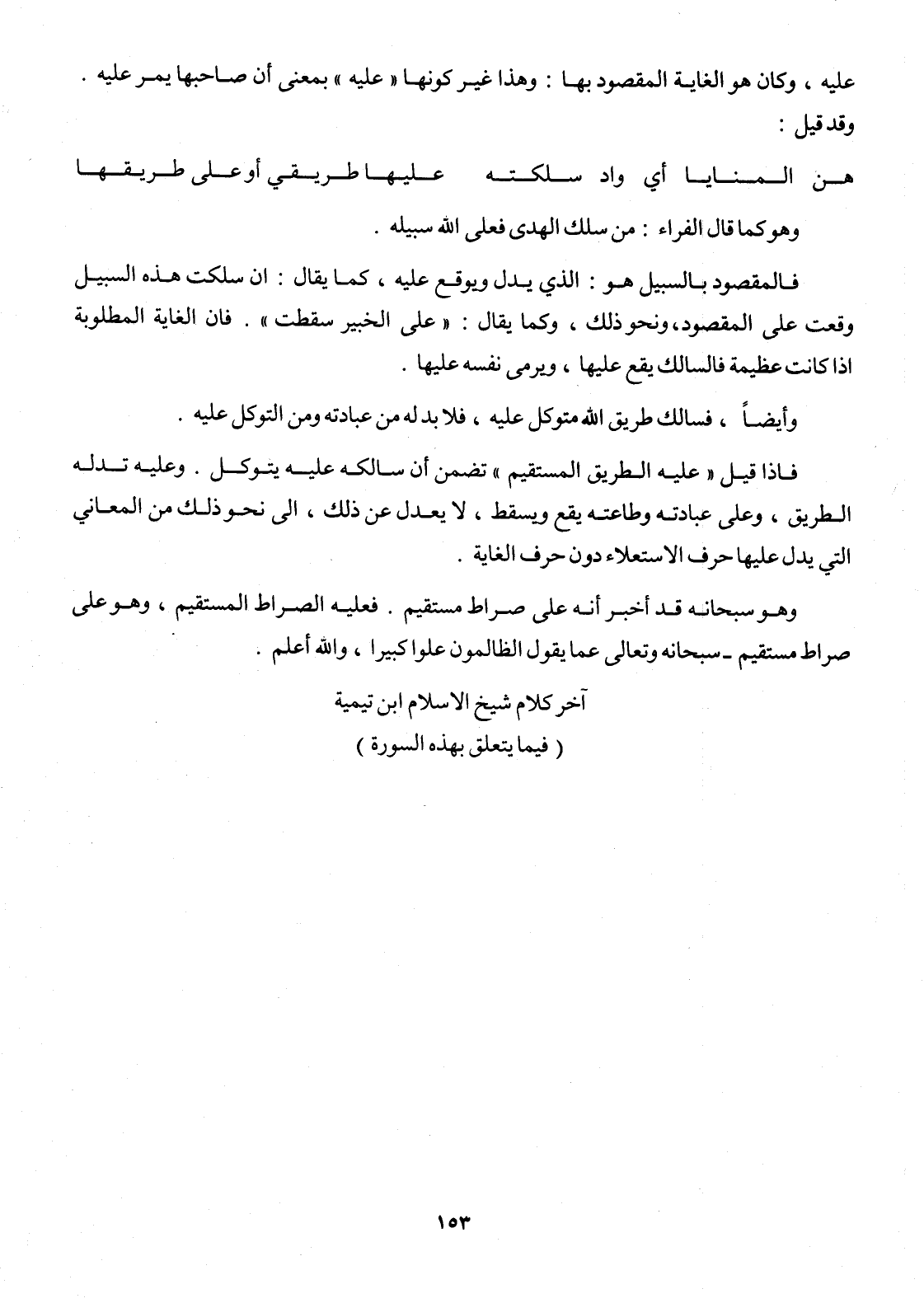 وَهُوَ سُبْحَانَهُ قد أخبر أَنه على صِرَاط مُسْتَقِيم فَعَلَيهِ الصِّرَاط الْمُسْتَقيم وَهُوَ على صِرَاط مُسْتَقِيم سُبْحَانَهُ وَتَعَالَى عَمَّا يَقُول الظَّالِمُونَ علوا كَبِيرا وَالله أعلم آخر كَلَام شيخ الاسلام ابْن تَيْمِية (فِيمَا يتَعَلَّق بِهَذِهِ السُّورَة)