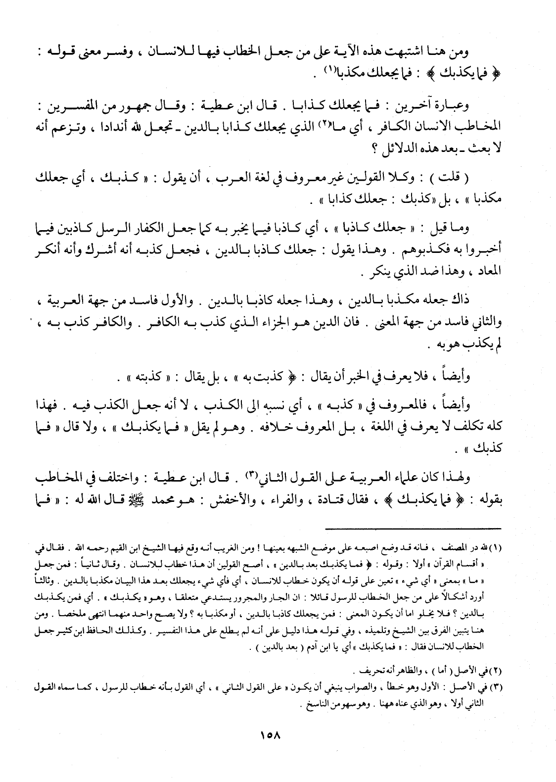 وَعبارَة آخَرين فَمَا يجعلك كذابا قَالَ ابْن عَطِيَّة وَقَالَ جُمْهُور من الْمُفَسّرين الْمُخَاطب الانسان الْكَافِر أَي مَا الَّذِي يجعلك كذابا بِالدّينِ تجْعَل لله أندادا وتزعم أَنه لَا بعث بعد هَذِه الدَّلَائِل
