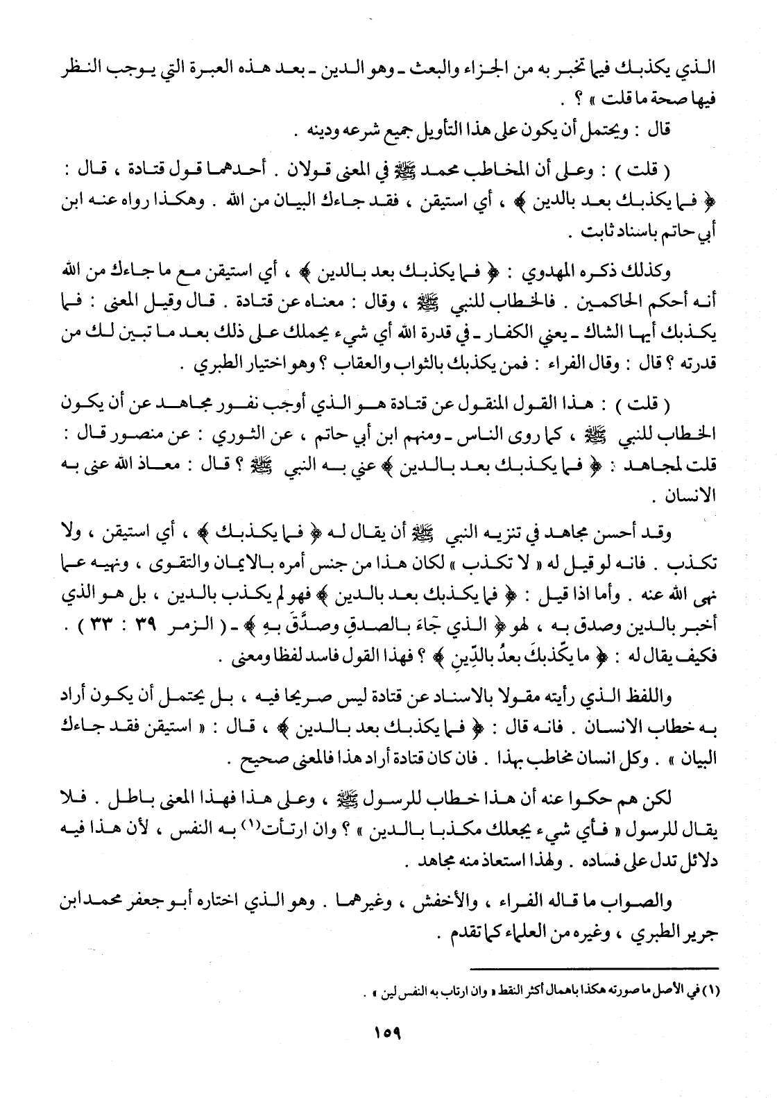 لَكِن هم حكوا عَنهُ أَن هَذَا خطاب للرسول صلى الله عَلَيْهِ وَسلم وعَلى هَذَا فَهَذَا الْمَعْنى بَاطِل فَلَا يُقَال للرسول فَأَي شَيْء يجعلك مُكَذبا بِالدّينِ وان ارتأت بِهِ النَّفس لِأَن هَذَا فِيهِ دَلَائِل تدل على فَسَاده وَلِهَذَا استعاذ مِنْهُ مُجَاهِد