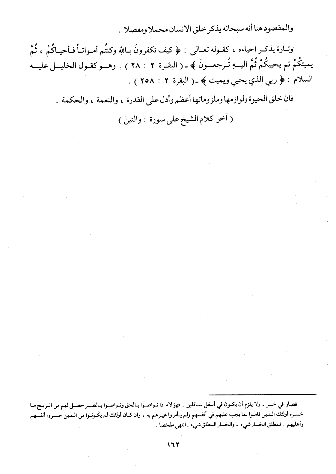 فان خلق الحيوة ولوازمها وملزوماتها أعظم وأدل على الْقُدْرَة وَالنعْمَة وَالْحكمَة (آخر كَلَام الشَّيْخ على سُورَة والتين)