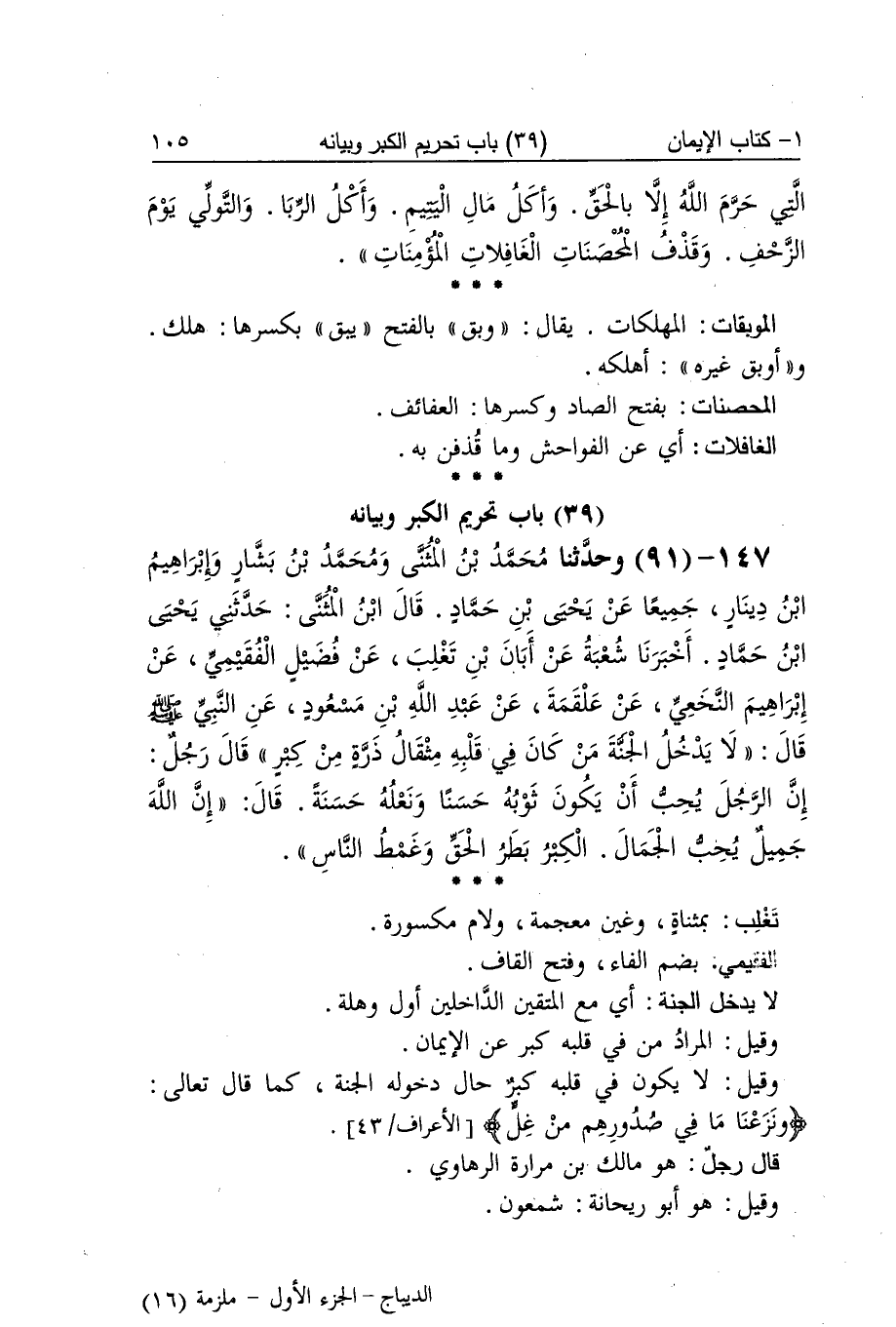 [89] الموبقات المهلكات يُقَال وبق بِالْفَتْح يبْق بِكَسْرِهَا هلك وأوبق غَيره أهلكه الْمُحْصنَات بِفَتْح الصَّاد وَكسرهَا العفائف الْغَافِلَات أَي عَن الْفَوَاحِش وَمَا قذفن بِهِ الْكبر