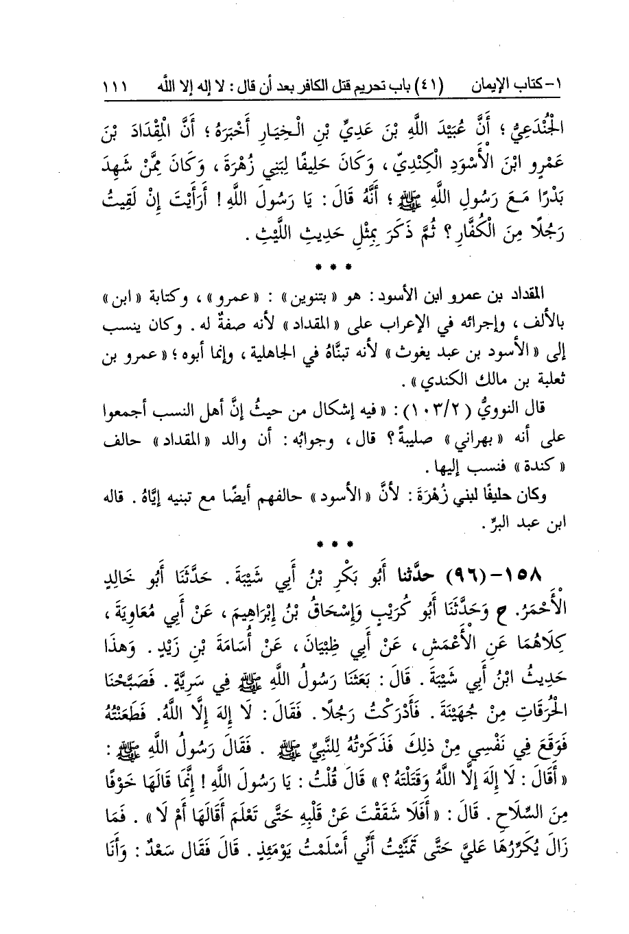 [95] أَرَأَيْت إِن لقِيت كَذَا فِي أَكثر الْأُصُول وَفِي بَعْضهَا أَرَأَيْت لقِيت بِحَذْف إِن لَاذَ اعْتصمَ فَإِن قتلته فَإِنَّهُ بمنزلتك قبل أَن تقتله أَي فِي الْعِصْمَة وَتَحْرِيم الدَّم وَإنَّك بِمَنْزِلَتِهِ قبل أَن يَقُول أَي أَنْت بعد قَتله غير مَعْصُوم الدَّم وَلَا محرم الْقَتْل قَالَه الشَّافِعِي وَغَيره أما الْأَوْزَاعِيّ وَابْن جريج فَفِي حَدِيثهمَا كَذَا فِي أَكثر الْأُصُول بِغَيْر فَاء وَفِي كثير فَفِي بهَا وَهُوَ الأَصْل وَالْأول على تَقْدِير حذفهَا مَعَ القَوْل أَي فَقَالَا أهويت قلت يُقَال أهويت وهويت الْمِقْدَاد بن عَمْرو بن الْأسود هُوَ بتنوين عَمْرو وَكِتَابَة بن بِالْألف وإجرائه فِي الْإِعْرَاب على الْمِقْدَاد لِأَنَّهُ صفة لَهُ وَكَانَ ينْسب إِلَى الْأسود بن عبد يَغُوث لِأَنَّهُ تبناه فِي الْجَاهِلِيَّة وَإِنَّمَا أَبوهُ عَمْرو بن ثَعْلَبَة بن مَالك الْكِنْدِيّ قَالَ النَّوَوِيّ فِيهِ إِشْكَال من حَيْثُ إِن أهل النّسَب أَجمعُوا على أَنه بهراني صليبة قَالَ وَجَوَابه أَن وَالِد الْمِقْدَاد حَالف كِنْدَة فنسب إِلَيْهَا وَكَانَ حليفا لبني زهرَة لِأَن الْأسود حالفهم أَيْضا مَعَ تبنيه إِيَّاه قَالَه بن عبد الْبر