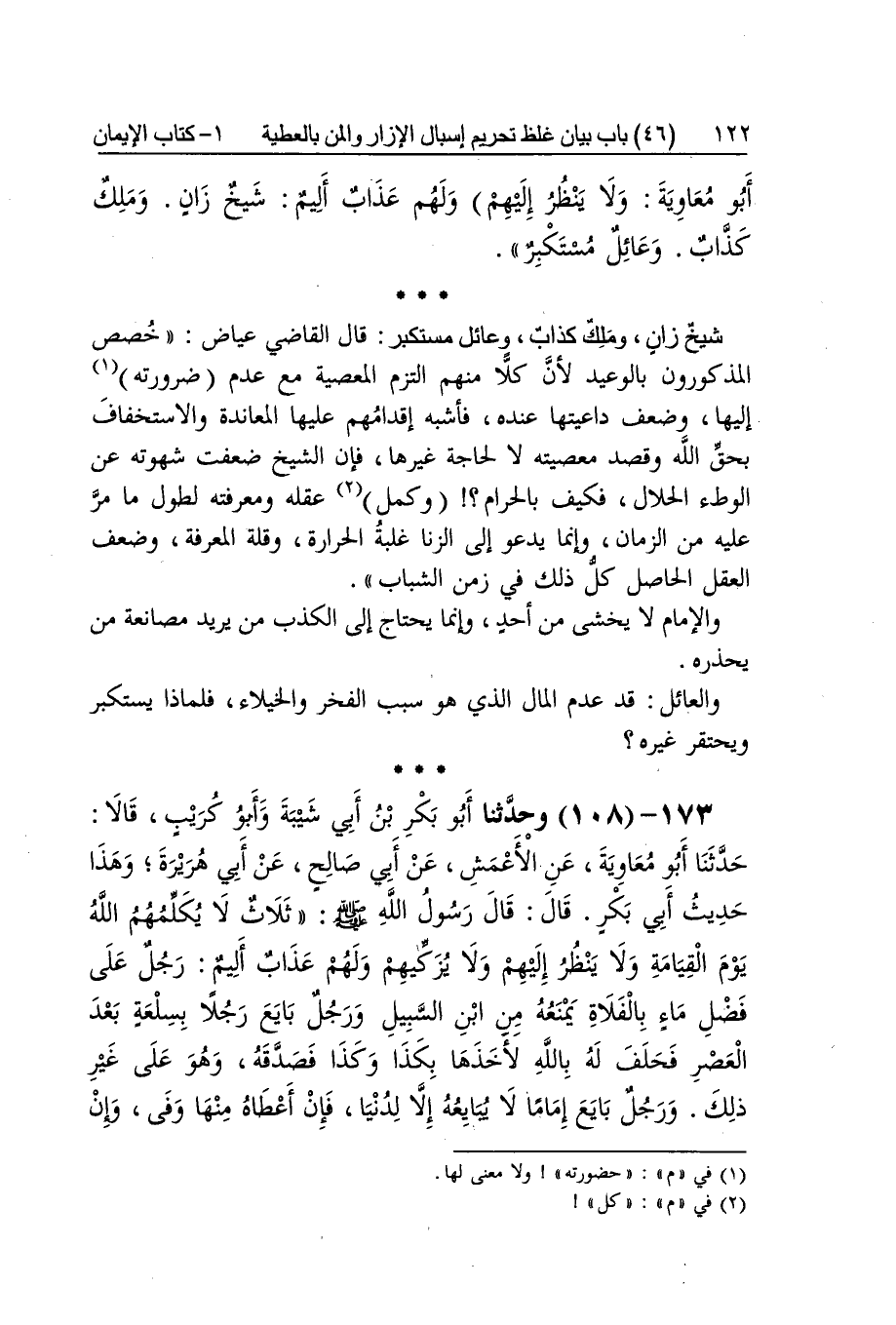 [107] شيخ زَان وَملك كَذَّاب وعائل مستكبر قَالَ القَاضِي عِيَاض خصص المذكورون بالوعيد لِأَن كلا مِنْهُم الْتزم الْمعْصِيَة مَعَ عدم ضَرُورَته إِلَيْهَا وَضعف داعيتها عِنْده فَأشبه إقدامهم عَلَيْهَا المعاندة وَالِاسْتِخْفَاف بِحَق الله وَقصد مَعْصِيَته لَا لحَاجَة غَيرهَا فَإِن الشَّيْخ ضعفت شَهْوَته عَن الْوَطْء الْحَلَال فَكيف بالحرام وكمل عقله ومعرفته لطول مَا مر عَلَيْهِ من الزَّمَان وَإِنَّمَا يَدْعُو إِلَى الزِّنَا غَلَبَة الْحَرَارَة وَقلة الْمعرفَة وَضعف الْعقل الْحَاصِل كل ذَلِك فِي زمن الشَّبَاب وَالْإِمَام لَا يخْشَى من أحد وَإِنَّمَا يحْتَاج إِلَى الْكَذِب من يُرِيد مصانعة من يحذرهُ والعائل قد عدم المَال الَّذِي هُوَ سَبَب الْفَخر وَالْخُيَلَاء فلماذا يستكبر ويحتقر غَيره
