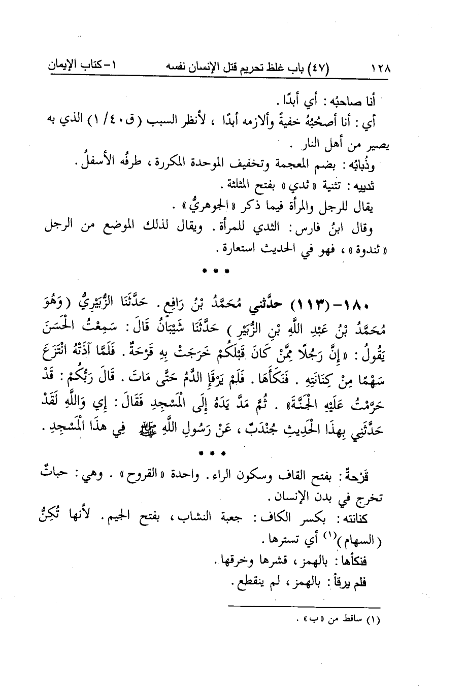 [112] لَا يدع لَهُم شَاذَّة أَي الْخَارِجَة عَن الْجَمَاعَة وَكَذَا الشاذ قَالَ القَاضِي أنث الْكَلِمَة على معنى النَّسمَة أَو تَشْبِيه الْخَارِج بشاذة الْغنم وَمَعْنَاهُ لَا يدع أحدا على طَرِيق الْمُبَالغَة قَالَ بن الْأَعرَابِي يُقَال فلَان لَا يدع شَاذَّة وَلَا فاذة إِذا كَانَ شجاعا لَا يلقاه أحد إِلَّا قَتله وَالرجل الْمَذْكُور اسْمه قزمان قَالَ الْخَطِيب وَكَانَ منافقا مَا أَجْزَأَ بِالْهَمْز أَي أغْنى أَنا صَاحبه أَي أبدا أَي أَنا أَصْحَبهُ خُفْيَة وألازمه أبدا لأنظر السَّبَب الَّذِي بِهِ يصير من أهل النَّار وذبابه بِضَم الْمُعْجَمَة وَتَخْفِيف الْمُوَحدَة المكررة طرفه الْأَسْفَل ثدييه تَثْنِيَة ثدي بِفَتْح الْمُثَلَّثَة يُقَال للرجل وَالْمَرْأَة فِيمَا ذكر الْجَوْهَرِي وَقَالَ بن فَارس الثدي للْمَرْأَة وَيُقَال لذَلِك الْموضع من الرجل ثندوة فَهُوَ فِي الحَدِيث اسْتِعَارَة