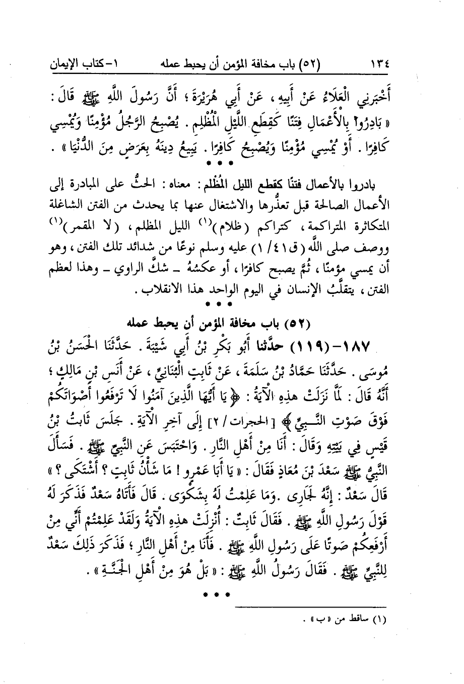 [118] بَادرُوا بِالْأَعْمَالِ فتنا كَقطع اللَّيْل المظلم مَعْنَاهُ الْحَث على الْمُبَادرَة إِلَى الْأَعْمَال الصَّالِحَة قبل تعذرها والاشتغال عَنْهَا بِمَا يحدث من الْفِتَن الشاغلة المتكاثرة المتراكمة كتراكم ظلام اللَّيْل المظلم لَا المقمر وَوصف صلى الله عَلَيْهِ وَسلم نوعا من شَدَائِد تِلْكَ الْفِتَن وَهُوَ أَن يُمْسِي مُؤمنا ثمَّ يصبح كَافِرًا أَو عَكسه شكّ الرَّاوِي وَهَذَا لعظم الْفِتَن يتقلب الْإِنْسَان فِي الْيَوْم الْوَاحِد هَذَا الانقلاب
