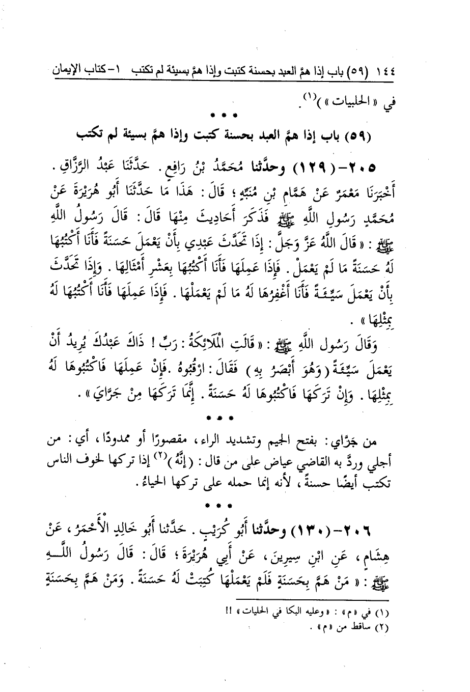 [129] من جراي بِفَتْح الْجِيم وَتَشْديد الرَّاء مَقْصُورا أَو ممدودا أَي من أَجلي ورد بِهِ القَاضِي عِيَاض على من قَالَ إِنَّه إِذا تَركهَا لخوف النَّاس تكْتب أَيْضا حَسَنَة لِأَنَّهُ إِنَّمَا حمله على تَركهَا الْحيَاء