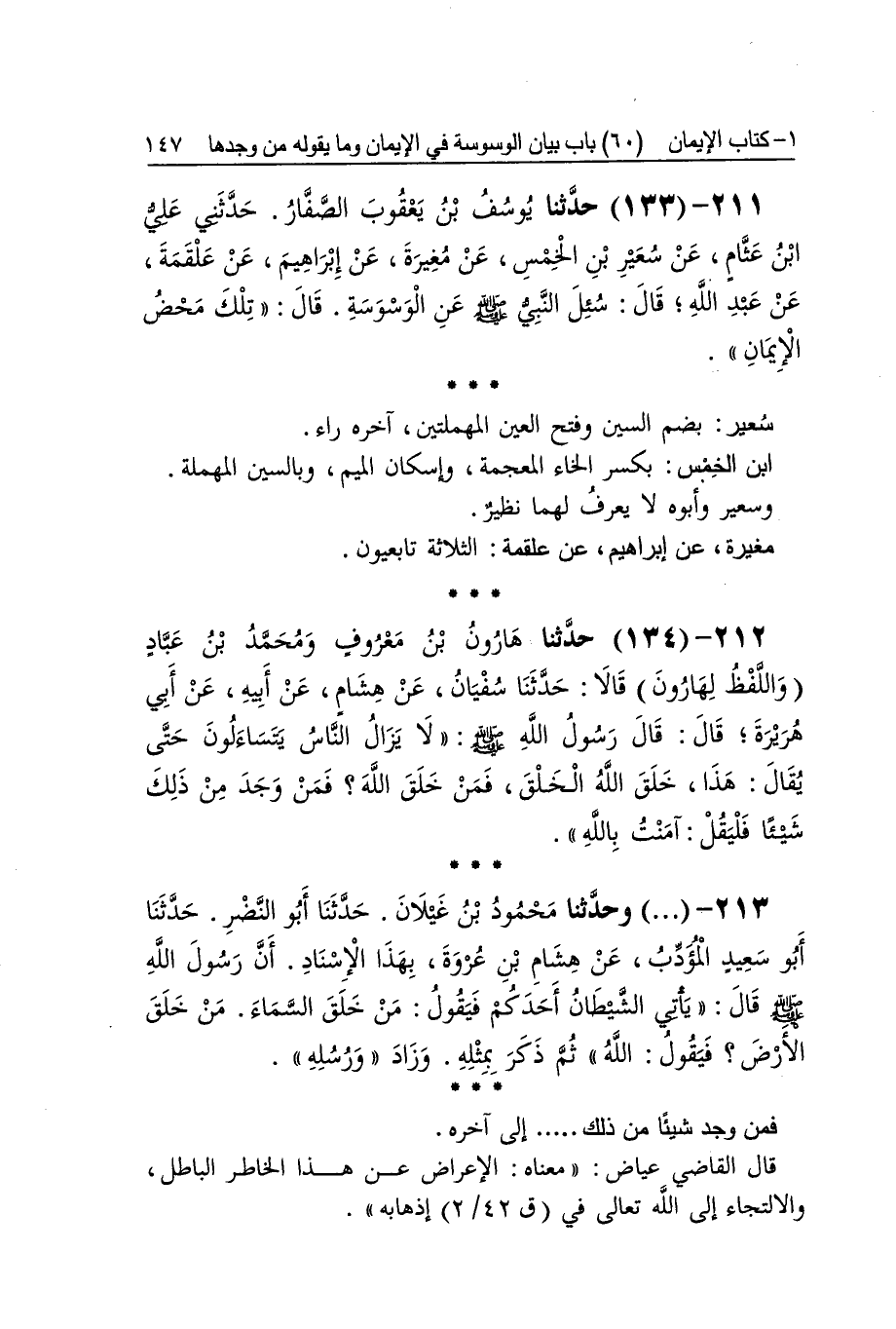 [132] ذَاك صَرِيح الْإِيمَان مَعْنَاهُ إِن استعظامكم الْكَلَام بِهِ هُوَ صَرِيح الْإِيمَان فَإِن استعظام ذَلِك وَشدَّة الْخَوْف مِنْهُ وَمن النُّطْق بِهِ فضلا عَن اعْتِقَاده يكون لمن اسْتكْمل الْإِيمَان استكمالا محققا وانتفت عَنهُ الرِّيبَة والشكوك وَقيل مَعْنَاهُ إِن الشَّيْطَان إِنَّمَا يوسوس لمن أيس من إغوائه فينكد عَلَيْهِ بالوسوسة لعَجزه عَن إغوائه وَأما الْكَافِر فَإِنَّهُ يَأْتِيهِ من حَيْثُ شَاءَ وَلَا يقْتَصر فِي حَقه على الوسوسة بل يتلاعب بِهِ كَيفَ أَرَادَ فعلى هَذَا معنى الحَدِيث سَبَب الوسوسة صَرِيح الْإِيمَان أَو الوسوسة عَلامَة صَرِيح الْإِيمَان أَبُو الْجَواب بِفَتْح الْجِيم وَتَشْديد الْوَاو آخِره مُوَحدَة