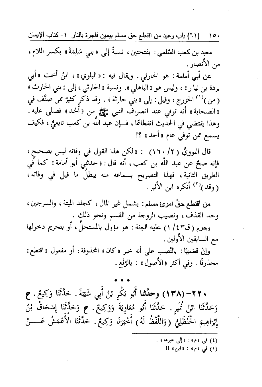 [137] معبد بن كَعْب السّلمِيّ بِفتْحَتَيْنِ نِسْبَة إِلَى بني سَلمَة بِكَسْر اللَّام من الْأَنْصَار عَن أبي أُمَامَة هُوَ الْحَارِثِيّ وَيُقَال فِيهِ البلوي بن أُخْت أبي بردة بن نيار وَلَيْسَ هُوَ الْبَاهِلِيّ وَنسبَة الْحَارِثِيّ إِلَى بني الْحَارِث من الْخَزْرَج وَقيل إِلَى بني حَارِثَة وَقد ذكر كثير مِمَّن صنف فِي الصَّحَابَة أَنه توفّي عِنْد انصراف النَّبِي صلى الله عَلَيْهِ وَسلم من أحد فصلى عَلَيْهِ وَهَذَا يَقْتَضِي فِي الحَدِيث انْقِطَاعًا فَإِن عبد الله بن كَعْب تَابِعِيّ فَكيف يسمع مِمَّن توفّي عَام أحد قَالَ النَّوَوِيّ لَكِن هَذَا القَوْل فِي وَفَاته لَيْسَ بِصَحِيح فَإِنَّهُ صَحَّ عَن عبد الله بن كَعْب أَنه قَالَ حَدثنِي أَبُو أُمَامَة كَمَا فِي الطَّرِيق الثَّانِيَة فَهَذَا التَّصْرِيح بِسَمَاعِهِ مِنْهُ يبطل مَا قيل فِي وَفَاته وَقد أنكرهُ بن الْأَثِير من اقتطع حق امْرِئ مُسلم يَشْمَل غير المَال كَجلْد الْميتَة والسرجين وحد الْقَذْف وَنصِيب الزَّوْجَة من الْقسم وَنَحْو ذَلِك وَحرم عَلَيْهِ الْجنَّة هُوَ مؤول بالمستحل أَو بِتَحْرِيم دُخُولهَا مَعَ السَّابِقين الْأَوَّلين وَإِن قَضِيبًا بِالنّصب على أَنه خبر كَانَ المحذوفة أَو مفعول اقتطع محذوفا وَفِي أَكثر الْأُصُول بِالرَّفْع