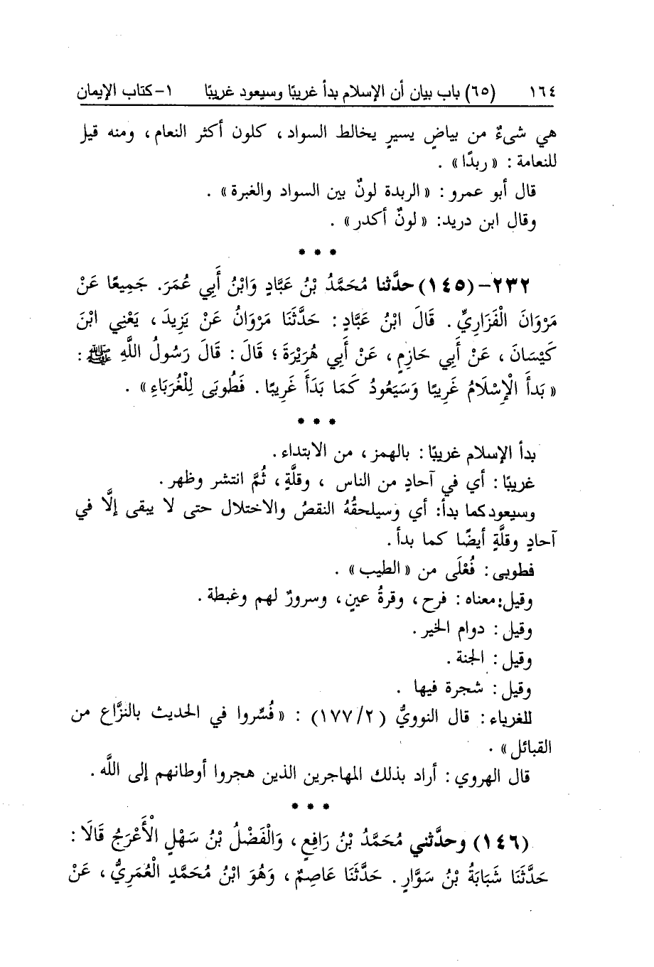 [145] بَدَأَ الْإِسْلَام غَرِيبا بِالْهَمْز من الِابْتِدَاء غَرِيبا أَي فِي آحَاد من النَّاس وَقلة ثمَّ انْتَشَر وَظهر وَسَيَعُودُ كَمَا بَدَأَ أَي وسيلحقه النَّقْص والاختلال حَتَّى لَا يبْقى إِلَّا فِي آحَاد وَقلة أَيْضا كَمَا بَدَأَ فطوبى فعلى من الطّيب وَقيل مَعْنَاهُ فَرح وقرة عين وسرور لَهُم وغبطة وَقيل دوَام الْخَيْر وَقيل الْجنَّة وَقيل شَجَرَة فِيهَا للغرباء قَالَ النَّوَوِيّ فسروا فِي الحَدِيث بالنزاع من الْقَبَائِل قَالَ الْهَرَوِيّ أَرَادَ بذلك الْمُهَاجِرين الَّذين هجروا أوطانهم إِلَى الله