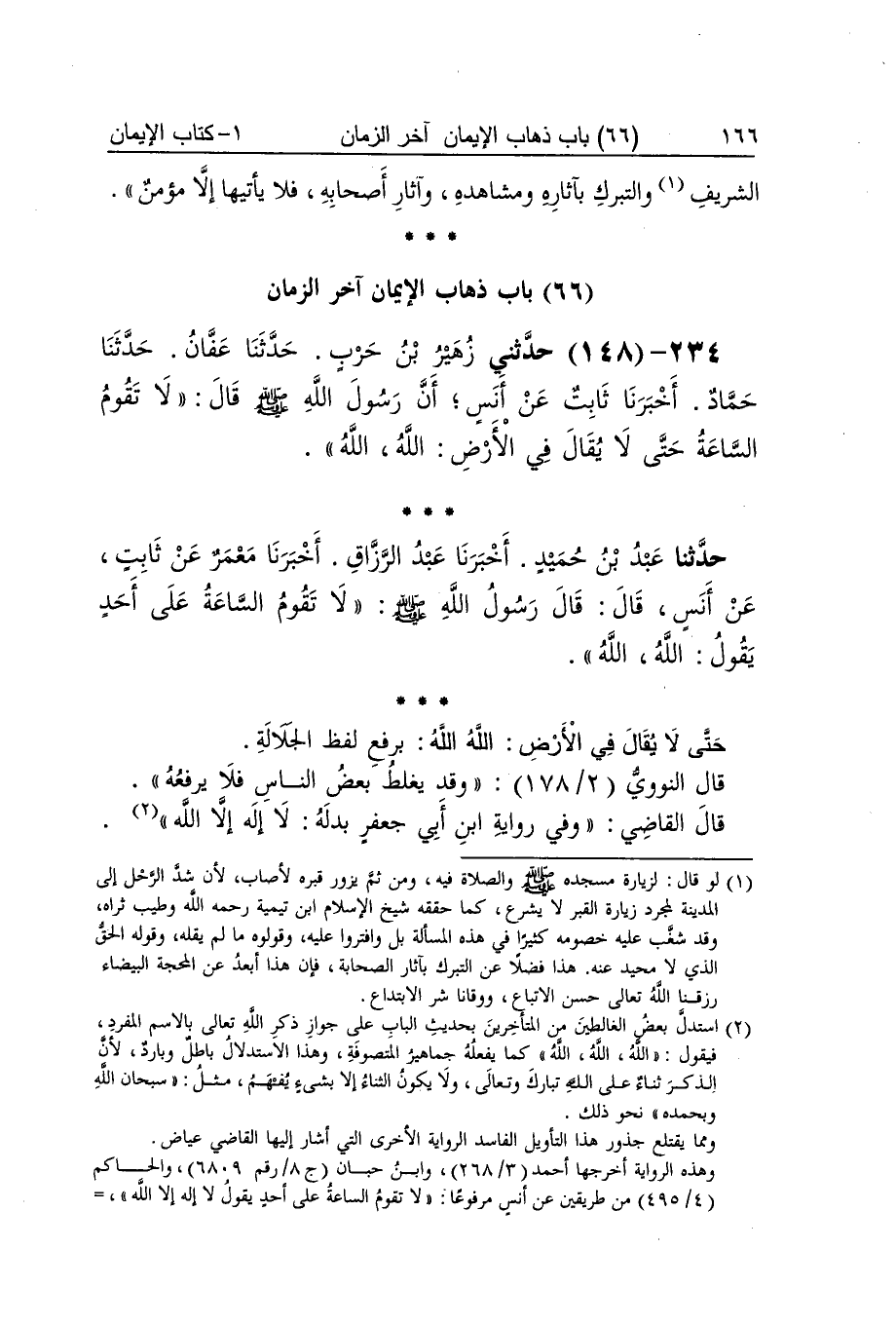 [147] إِن الْإِيمَان ليأرز إِلَى الْمَدِينَة قَالَ القَاضِي مَعْنَاهُ أَن الْإِيمَان أَولا وآخرا بِهَذِهِ الصّفة لِأَنَّهُ فِي أول الْإِسْلَام كَانَ كل من خلص إيمَانه وَصَحَّ إِسْلَامه فِي الْمَدِينَة أَتَى مُهَاجرا متوطنا وَإِمَّا متشوقا إِلَى رُؤْيَة رَسُول الله صلى الله عَلَيْهِ وَسلم ومتعلما مِنْهُ ومتقربا ثمَّ بعد هَذَا فِي زمن الْخُلَفَاء كَذَلِك ولأخذ سيرة الْعدْل مِنْهُم والاقتداء بجمهور الصَّحَابَة فِيهَا ثمَّ من بعدهمْ من الْعلمَاء الَّذين كَانُوا سرج الْوَقْت وأئمة الْهدى لأخذ السّنَن المنتشرة بهَا عَنْهُم وَكَانَ كل مِنْهُم ثَابت الْإِيمَان منشرح الصَّدْر بِهِ يرحل إِلَيْهَا ثمَّ بعد ذَلِك فِي كل وَقت وَإِلَى زَمَاننَا لزيارة قَبره الشريف والتبرك بآثاره ومشاهده وآثار الصَّحَابَة فَلَا يَأْتِيهَا إِلَّا مُؤمن