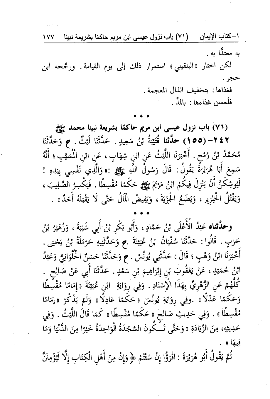 [154] صَالح بن صَالح الْهَمدَانِي عَن الشّعبِيّ قَالَ رَأَيْت رجلا من أهل خُرَاسَان سَأَلَ الشّعبِيّ قَالَ النَّوَوِيّ هَذَا الْكَلَام لَيْسَ منتظما فِي الظَّاهِر وَلَكِن تَقْدِيره حَدثنَا صَالح عَن الشّعبِيّ بِحَدِيث وقصة طَوِيلَة قَالَ فِيهَا صَالح رَأَيْت رجلا سَأَلَ الشّعبِيّ ثَلَاثَة يُؤْتونَ أجرهم مرَّتَيْنِ للطبراني من حَدِيث أبي أُمَامَة مَرْفُوعا أَرْبَعَة يُؤْتونَ أجرهم مرَّتَيْنِ فَذكر الثَّلَاثَة وَزَاد أَزوَاج النَّبِي صلى الله عَلَيْهِ وَسلم وَقد وَردت الْأَحَادِيث والْآثَار بِأَكْثَرَ من ذَلِك وجمعتها فِي جُزْء فبلغت أَرْبَعِينَ رجل من أهل الْكتاب أَي التَّوْرَاة وَالْإِنْجِيل وَقيل الْإِنْجِيل خَاصَّة لِأَن النَّصْرَانِيَّة ناسخة لِلْيَهُودِيَّةِ وَأجَاب الطَّيِّبِيّ بِأَنَّهُ لَا يبعد أَن يكون طريان الْإِيمَان بِمُحَمد صلى الله عَلَيْهِ وَسلم سَببا لقبُول ذَلِك الدّين وَإِن كَانَ مَنْسُوخا آمن بِنَبِيِّهِ وَأدْركَ النَّبِي صلى الله عَلَيْهِ وَسلم فَآمن بِهِ وَاتبعهُ وَصدقه يسْتَدلّ بِهَذَا اللَّفْظ لما قَالَه الْكرْمَانِي من اخْتِصَاص ذَلِك بِمن آمن فِي عَهده صلى الله عَلَيْهِ وَسلم بِخِلَاف من بعده إِلَى يَوْم الْقِيَامَة لِأَن بعثته قد أبطلت مَا قبلهَا من الْأَدْيَان فَلم يكن الْإِيمَان بِهِ معتدا بِهِ لَكِن اخْتَار البُلْقِينِيّ اسْتِمْرَار ذَلِك إِلَى يَوْم الْقِيَامَة وَرجحه بن حجر فغذاها بتَخْفِيف الذَّال الْمُعْجَمَة فَأحْسن غذاءها بِالْمدِّ