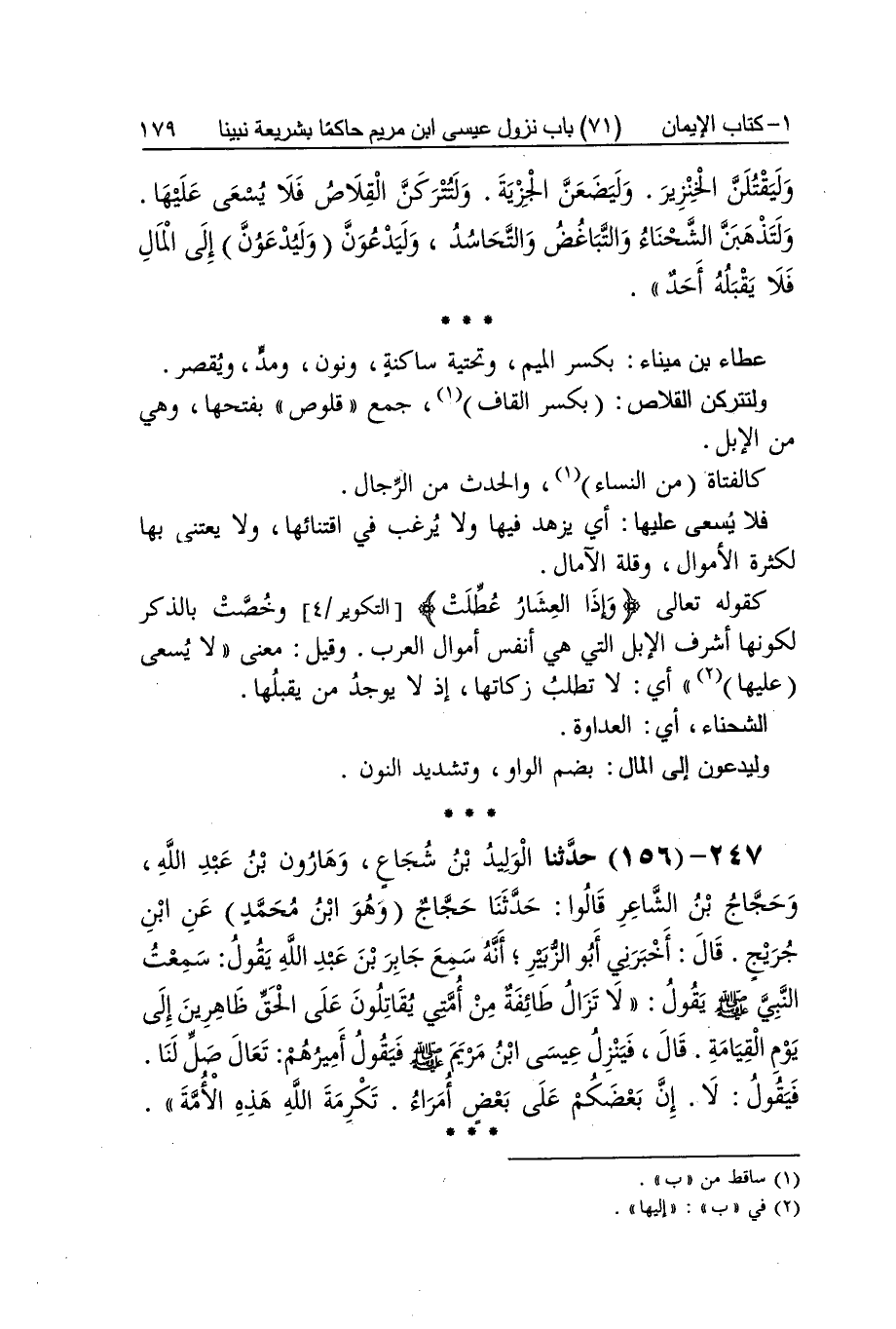 [155] ليوشكن بِضَم الْيَاء وَكسر الشين أَي ليقربن فِيكُم أَي فِي هَذِه الْأمة وَإِن كَانَ خطابا لبعضها مِمَّن لم يدْرك نُزُوله حكما أَي حَاكما مقسطا أَي عادلا وَيَضَع الْجِزْيَة أَي لَا يقبلهَا وَلَا يقبل من الْكفَّار إِلَّا الْإِسْلَام وَلَا يُنَافِي ذَلِك كَونهَا مَشْرُوعَة من نَبينَا صلى الله عَلَيْهِ وَسلم وَهُوَ لَا يُغير شَرعه لِأَن النَّبِي صلى الله عَلَيْهِ وَسلم شرعها مغياة بنزول عِيسَى بِهَذَا الحَدِيث وَغَيره وَلم يشرعها مستمرة إِلَى يَوْم الْقِيَامَة وَقيل مَعْنَاهُ يضع الْجِزْيَة على كل الْكَفَرَة وَلَا يقاتله أحد وَمِنْهَا يفِيض المَال قَالَ النَّوَوِيّ وَالصَّوَاب الأول وَيفِيض المَال بِفَتْح الْيَاء يكثر وتنزل البركات والخيرات بِسَبَب الْعدْل وَعدم الظُّلم وتقل أَيْضا الرغبات لقصر الآمال وعلمهم بِقرب السَّاعَة فَإِن عِيسَى علم من أعلامها وَحَتَّى تكون السَّجْدَة الْوَاحِدَة خيرا من الدُّنْيَا وَمَا فِيهَا قَالَ النَّوَوِيّ مَعْنَاهُ أَن النَّاس تكْثر رغبتهم فِي الصَّلَاة وَسَائِر الطَّاعَات لعلمهم بِقرب السَّاعَة قَالَ القَاضِي مَعْنَاهُ أَن أجرهَا خير لمصليها من صدقته بالدنيا وَمَا فِيهَا لفيض المَال حِينَئِذٍ وهوانه وَقلة الشُّح بِهِ وَقلة الْحَاجة إِلَيْهِ قَالَ والسجدة هِيَ السَّجْدَة بِعَينهَا أَو عبارَة عَن الصَّلَاة عَطاء بن ميناء بِكَسْر الْمِيم وتحتية سَاكِنة وَنون وَمد وَيقصر ولتتركن القلاص بِكَسْر الْقَاف جمع قلُوص بِفَتْحِهَا وَهِي من الْإِبِل كالفتاة من النِّسَاء وَالْحَدَث من الرِّجَال فَلَا يسْعَى عَلَيْهَا أَي يزهد فِيهَا وَلَا يرغب فِي اقتنائها وَلَا يعتني بهَا لِكَثْرَة الْأَمْوَال وَقلة الآمال كَقَوْلِه تَعَالَى وَإِذا العشار عطلت وخصت بِالذكر لكَونهَا أشرف الْإِبِل الَّتِي هِيَ أنفس أَمْوَال الْعَرَب وَقيل معنى لَا يسْعَى عَلَيْهَا أَي لَا تطلب زَكَاتهَا إِذْ لَا يُوجد من يقبلهَا الشحناء أَي الْعَدَاوَة وليدعون إِلَى المَال بِضَم الْوَاو وَتَشْديد النُّون