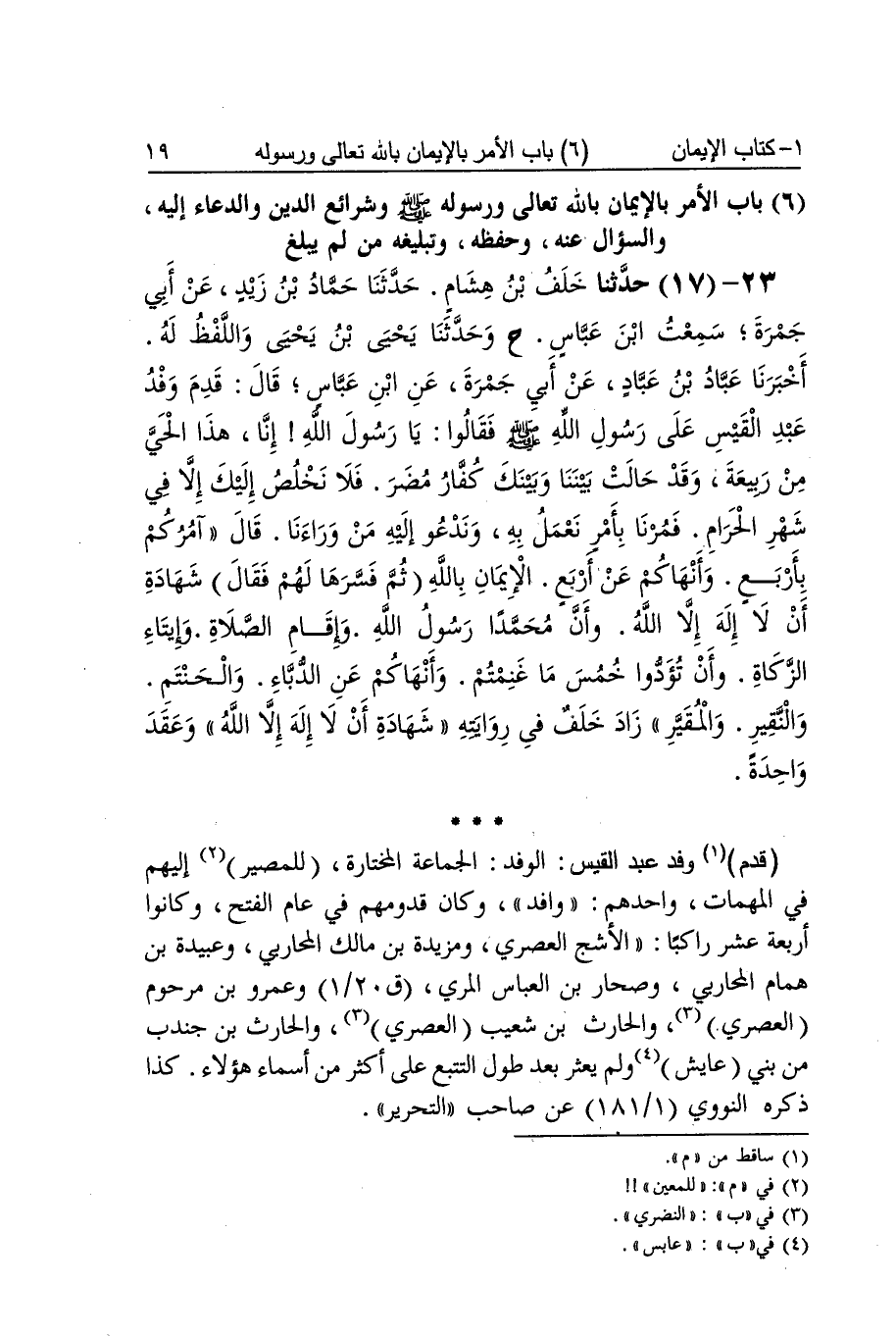 [16] سُلَيْمَان بن حَيَّان بالتحتية بني الْإِسْلَام على خَمْسَة كَذَا فِي الطَّرِيق الأول وَالرَّابِع أَي أَرْكَان أَو أَشْيَاء وَفِي الثَّانِي وَالثَّالِث على خمس أَي خِصَال أَو دعائم أَو قَوَاعِد يوحد بِالْبِنَاءِ للْمَفْعُول فَقَالَ رجل الْحَج وَصِيَام رَمَضَان قَالَ لَا صِيَام رَمَضَان وَالْحج هَكَذَا سمعته من رَسُول الله وَقع فِي مستخرج أبي عوَانَة عكس ذَلِك وَهُوَ أَن بن عمر قَالَ للرجل اجْعَل صِيَام رَمَضَان آخِرهنَّ كَمَا سَمِعت من رَسُول الله قَالَ بن الصّلاح لَا تقاوم هَذِه الرِّوَايَة مَا رَوَاهُ مُسلم قَالَ النَّوَوِيّ وَيحْتَمل أَن يكون جرت الْقِصَّة مرَّتَيْنِ لِرجلَيْنِ وَأَن بن عمر سَمعه من النَّبِي صلى الله عَلَيْهِ وَسلم مرَّتَيْنِ مرّة بِتَقْدِيم الْحَج وَمرَّة بِتَأْخِيرِهِ قَالَ وَاسم الرجل الَّذِي رد عَلَيْهِ تَقْدِيم الْحَج يزِيد بن بشر السكْسكِي ذكره الْخَطِيب فِي مبهماته أَن رجلا اسْمه حَكِيم ذكره الْبَيْهَقِيّ أَلا تغزو بتاء الْخطاب فَقَالَ إِنِّي سَمِعت إِلَى آخِره وَزَاد عبد الرَّزَّاق بِآخِرهِ وَإِن الْجِهَاد من الْعَمَل الْحسن