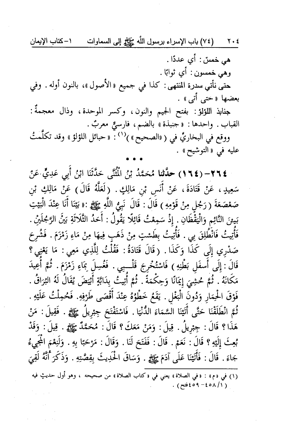 [163] فرج سقف بَيْتِي بِضَم الْفَاء وجيم أَي فتح فَفرج صَدْرِي بِفَتْح الْفَاء وَالرَّاء وَالْجِيم أَي شقّ فَإِن قيل إِنَّمَا وَقع شقّ الصَّدْر وَهُوَ صَغِير كَمَا تقدم فِي حَدِيث ثَابت عَن أنس فَالْجَوَاب كَمَا قَالَ السُّهيْلي إِنَّه وَقع مرَّتَيْنِ الثَّانِيَة عِنْد الْإِسْرَاء تجديدا للتطهير زَاد بن حجر ثَالِثَة عِنْد المبعث بِغَار حراء ورد من حَدِيث عَائِشَة فِي مسندي الطَّيَالِسِيّ وَابْن أبي أُسَامَة بطست من ذهب ممتلئ ذكره والطست مُؤَنّثَة عودا على الْمَعْنى وَهُوَ الْإِنَاء حِكْمَة وإيمانا فِيهِ أَنَّهُمَا يمثلان جسما يمْلَأ كَمَا يمثل الْمَوْت كَبْشًا وَقَالَ النَّوَوِيّ إِنَّه مجَاز وَكَأَنَّهُ كَانَ فِي الطست شَيْء يحصل بِهِ كَمَال الْإِيمَان وَالْحكمَة فَسُمي إِيمَانًا وَحِكْمَة لكَونه سَببا لَهما فأفرغها الضَّمِير للطست وَقيل للحكمة وَضَعفه النَّوَوِيّ بِأَنَّهُ يصير إفراغ الْإِيمَان مسكوتا عَنهُ لخازن السَّمَاء الدُّنْيَا أَسْوِدَة بِوَزْن أزمنة جمع سَواد وَهُوَ الشَّخْص نسم بِفَتْح النُّون والمهملة جمع نسمَة وَهِي الرّوح والأسودة الَّتِي عَن شِمَاله أهل النَّار قَالَ القَاضِي ظَاهر الحَدِيث أَن نسم الْكفَّار أَيْضا فِي السَّمَاء وَهُوَ مُشكل فَإِن أَرْوَاحهم فِي سِجِّين وَلَا تفتح لَهُم أَبْوَاب السَّمَاء فَيحْتَمل أَنَّهَا تعرض على آدم أوقاتا فَوَافَقَ وَقت عرضهَا مُرُور النَّبِي صلى الله عَلَيْهِ وَسلم وَيحْتَمل أَن الْجنَّة كَانَت فِي جِهَة يَمِين آدم وَالنَّار فِي جِهَة شِمَاله وَكِلَاهُمَا من حَيْثُ شَاءَ الله ويكشف لآدَم عَنْهُمَا وَلَا يلْزم من ذَلِك فتح بَاب السَّمَاء لَهَا فَذكر أَي أَبُو ذَر وَلم يثبت أَي أَبُو ذَر وَإِبْرَاهِيم فِي السَّمَاء السَّادِسَة الثَّابِت فِي جَمِيع الرِّوَايَات السَّابِعَة وَقد ذكر أَبُو ذَر أَنه لم يثبت كَيفَ مَنَازِلهمْ فرواية من أثبتهم أرجح قَالَه بن حجر بِإِدْرِيس قَالَ مرْحَبًا بِالنَّبِيِّ الصَّالح وَالْأَخ الصَّالح فِيهِ دَلِيل لكَون إِدْرِيس هُوَ إلْيَاس لَا جد نوح وَإِلَّا لقَالَ وَالِابْن الصَّالح كَمَا قَالَ آدم وَإِبْرَاهِيم قَالَه عِيَاض ثمَّ مَرَرْت بِعِيسَى لَيست ثمَّ هُنَا للتَّرْتِيب لِأَن الرِّوَايَات متفقة على أَن الْمُرُور بِهِ كَانَ قبل مُوسَى وَهَذَا أَيْضا يدل على أَنه لم يثبت مَنَازِلهمْ وَأَبا حَبَّة بِالْمُهْمَلَةِ وَالْمُوَحَّدَة الْمُشَدّدَة وَقَالَ الْقَابِسِيّ بمثناة تحتية وَغلط فِي ذَلِك وَذكره الْوَاقِدِيّ بالنُّون اسْتشْهد بِأحد ظَهرت عَلَوْت لمستوى بِالْفَتْح هُوَ المصعد صريف الأقلام بِفَتْح الصَّاد الْمُهْملَة تصويتها حَال الْكِتَابَة وَالْمرَاد بهَا مَا تكتبه الْمَلَائِكَة من أقضية الله تَعَالَى سُبْحَانَهُ قَالَ بن حزم أَي عَن شيخيه وَأنس عَن أبي ذَر كَذَا جزم بِهِ أَصْحَاب الْأَطْرَاف قَالَ بن حجر يحْتَمل أَن يكون مُرْسلا من جِهَة بن حزم وَمن رِوَايَة أنس بِلَا وَاسِطَة فَوضع شطرها قَالَ النَّوَوِيّ المُرَاد أَنه حط مَرَّات بمراجعات فَإِن الحَدِيث مُخْتَصر لم يذكر فِيهِ كرات الْمُرَاجَعَة هِيَ خمس أَي عددا وَهِي خَمْسُونَ أَي ثَوابًا حَتَّى نأتي سِدْرَة الْمُنْتَهى كَذَا فِي جَمِيع الْأُصُول بالنُّون أَوله وَفِي بَعْضهَا حَتَّى أَتَى جنابذ اللُّؤْلُؤ بِفَتْح الْجِيم وَالنُّون وَكسر الْمُوَحدَة وذال مُعْجمَة القباب وَاحِدهَا جنبذة بِالضَّمِّ فَارسي مُعرب وَوَقع فِي البُخَارِيّ فِي الصَّحِيح حبائل اللُّؤْلُؤ وَقد تَكَلَّمت عَلَيْهِ فِي التوشيح
