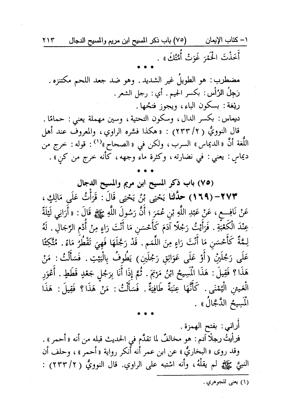 [168] مُضْطَرب هُوَ الطَّوِيل غير الشَّديد وَهُوَ ضد جعد اللَّحْم مكتنزه رجل الرَّأْس بِكَسْر الْجِيم أَي رجل الشّعْر ربعَة بِسُكُون الْبَاء وَيجوز فتحهَا ديماس بِكَسْر الدَّال وَسُكُون التَّحْتِيَّة وسين مُهْملَة يَعْنِي حَماما قَالَ النَّوَوِيّ هَكَذَا فسره الرَّاوِي وَالْمَعْرُوف عِنْد أهل اللُّغَة أَن الديماس السرب وَلَكِن فِي الصِّحَاح قَوْله خرج من ديماس يَعْنِي فِي نضارته وَكَثْرَة مَاء وَجهه كَأَنَّهُ خرج من كن