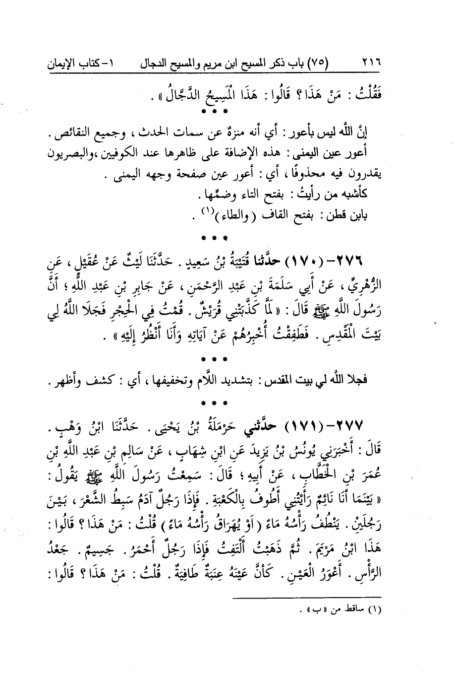 [169] أَرَانِي بِفَتْح الْهمزَة فَرَأَيْت رجلا آدم هُوَ مُخَالف لما تقدم فِي الحَدِيث قبله من أَنه أَحْمَر وَقد روى البُخَارِيّ عَن بن عمر أَنه أنكر رِوَايَة أَحْمَر وَحلف أَن النَّبِي صلى الله عَلَيْهِ وَسلم لم يقلهُ وَأَنه اشْتبهَ على الرَّاوِي قَالَ النَّوَوِيّ فَيجوز أَن يتَأَوَّل الْأَحْمَر على الآدم وَلَا يكون المُرَاد حَقِيقَة الْحمرَة والأدمة بل مَا قاربهما لمة بِكَسْر اللَّام وَتَشْديد الْمِيم الشّعْر المتدلي الَّذِي يُجَاوز شحمة الْأُذُنَيْنِ فَإِذا بلغ الْمَنْكِبَيْنِ فَهُوَ جمة رجلهَا بتَشْديد الْجِيم سرحها فَهِيَ تقطر قيل هُوَ على ظَاهره أَي يقطر بِالْمَاءِ الَّذِي رجلهَا بِهِ لقرب ترجيله وَقيل هُوَ عبارَة عَن نضارته وَحسنه واستعارة لجماله عواتق جمع عاتق وَهُوَ مَا بَين الْمنْكب والعنق يؤنث وَيذكر والتذكير أشهر الْمَسِيح بن مَرْيَم قيل أَصله مشيحا بالعبرانية فعرب وَغير وَقيل هُوَ عَرَبِيّ وَسمي بِهِ لِأَنَّهُ لم يمسح ذَا عاهة إِلَّا برِئ وَقيل لِأَنَّهُ مَمْسُوح أَسْفَل الْقَدَمَيْنِ لَا أَخْمص لَهُ وَقيل لمسحه الأَرْض أَي قطعهَا وَقيل لِأَنَّهُ خرج من بطن أمه ممسوحا بالدهن وَقيل لِأَنَّهُ مسح بِالْبركَةِ حِين ولد بِرَجُل جعد قَالَ الْهَرَوِيّ الْجَعْد فِي صِفَات الرجل يكون مدحا وَيكون ذما فالذم بِمَعْنى الْقصير المتردد وَبِمَعْنى الْبَخِيل يُقَال رجل جعد الْيَدَيْنِ وجعد الْأَصَابِع أَي بخيل والمدح بِمَعْنى شَدِيد الْخلق وَبِمَعْنى عدم سبوطة الشّعْر وَإِنَّمَا مدح بِهَذَا لِأَن السبوطة أَكْثَرهَا فِي شُعُور الْعَجم قَالَ الْهَرَوِيّ فالجعد فِي صفة عِيسَى مدح وَفِي صفة الدَّجَّال ذمّ قطط بِفَتْح الْقَاف والطاء الأولى وَقد تكسر الشَّديد الجعودة أَعور الْعين الْيُمْنَى فِي رِوَايَة الْيُسْرَى وَكِلَاهُمَا صَحِيح طافية رُوِيَ بِالْهَمْز بِمَعْنى ذهب ضوءها وبدونه وَصَححهُ الْأَكْثَر بِمَعْنى ناتئة بارزة كنتوء حَبَّة الْعِنَب وَقَالَ القَاضِي كلا عَيْني الدَّجَّال مَعِيبَة عوراء فاليمنى مطموسة وَهِي الطافئة بِالْهَمْز واليسرى ناتئة جاحظة كَأَنَّهَا كَوْكَب وَهِي الطافية بِلَا همز الْمَسِيح الدَّجَّال سمي بذلك لِأَنَّهُ مَمْسُوح الْعين وَقيل لمسحه الأَرْض إِذا خرج وَالْأَشْهر أَنه بِفَتْح الْمِيم وَتَخْفِيف السِّين وإهمال الْحَاء كوصف عِيسَى وَقيل هُوَ بِكَسْر الْمِيم وَتَشْديد السِّين وَقيل هُوَ بإعجام الْخَاء كَالْأولِ وَقيل كالثاني إِن الله لَيْسَ بأعور أَي أَنه منزه عَن سمات الْحَدث وَجَمِيع النقائص أَعور عين الْيُمْنَى هَذِه الْإِضَافَة على ظَاهرهَا عِنْد الْكُوفِيّين والبصريون يقدرُونَ فِيهِ محذوفا أَي أَعور عين صفحة وَجهه الْيُمْنَى كأشبه من رَأَيْت بِفَتْح التَّاء وَضمّهَا بِابْن قطن بِفَتْح الْقَاف والطاء