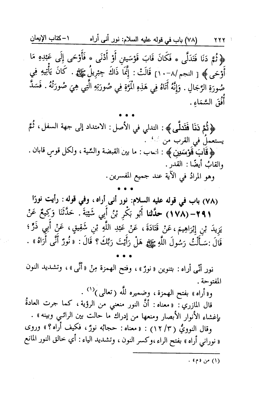 [177] مَسْرُوق قَالَ السَّمْعَانِيّ فِي الْأَنْسَاب سمي مسروقا لِأَنَّهُ سَرقه إِنْسَان فِي صغره ثمَّ وجد الْفِرْيَة بِكَسْر الْفَاء وَسُكُون الرَّاء الْكَذِب أنظريني أَي أمهليني عظم خلقه ضبط بِضَم الْعين وَسُكُون الظَّاء وبكسرها وَفتح الظَّاء أولم تسمع أَن الله يَقُول لَا تُدْرِكهُ الْأَبْصَار قَالَ النَّوَوِيّ الرَّاجِح عِنْد أَكثر الْعلمَاء أَنه صلى الله عَلَيْهِ وَسلم رأى ربه بعيني رَأسه لَيْلَة الْإِسْرَاء لحَدِيث بن عَبَّاس وَغَيره وَإِثْبَات هَذَا لَا يكون إِلَّا بِالسَّمَاعِ من رَسُول الله صلى الله عَلَيْهِ وَسلم وَلم تعتمد عَائِشَة فِي نفي الرُّؤْيَة على حَدِيث رَسُول الله صلى الله عَلَيْهِ وَسلم وَإِنَّمَا اعتمدت الاستنباط من الْآيَات وَالْجَوَاب عَن هَذِه الْآيَة أَن الْإِدْرَاك هُوَ الْإِحَاطَة وَالله تَعَالَى لَا يحاط بِهِ وَإِذا ورد النَّص بِنَفْي الْإِحَاطَة فَلَا يلْزم مِنْهُ نفي الرُّؤْيَة بِغَيْر إحاطة أولم تسمع أَن الله يَقُول مَا كَانَ لبشر كَذَا فِي الْأُصُول بِلَا وَاو والتلاوة وَمَا كَانَ بِإِثْبَات الْوَاو وَقَالَ النَّوَوِيّ وَلَا يضر هَذَا فِي الرِّوَايَة وَالِاسْتِدْلَال لِأَن الْمُسْتَدلّ لَيْسَ مَقْصُوده التِّلَاوَة على وَجههَا وَإِنَّمَا مَقْصُودَة بَيَان مَوضِع الدّلَالَة وَلَا يُؤثر حذف الْوَاو فِي ذَلِك قف شعري أَي قَامَ من الْفَزع قَالَ النَّضر بن شُمَيْل القفة كَهَيئَةِ قشعريرة وَأَصله التقبض والاجتماع لِأَن الْجلد ينقبض عِنْد الْفَزع فَيقوم الشّعْر لذَلِك ثمَّ دنا فَتَدَلَّى التدلي فِي الأَصْل الامتداد إِلَى جِهَة السّفل ثمَّ يسْتَعْمل فِي الْقرب من قاب قوسين ألقاب مَا بَين القبضة والسية وَلكُل قَوس قابان والقاب أَيْضا الْقدر وَهُوَ المُرَاد فِي الْآيَة عِنْد جَمِيع الْمُفَسّرين