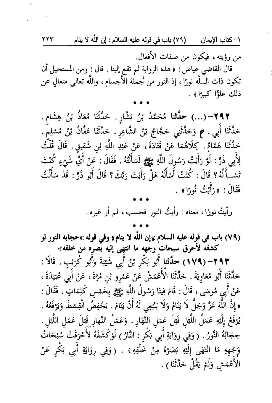 [178] نور أَنى أرَاهُ بتنوين نور وَفتح الْهمزَة من أَنى وَتَشْديد النُّون الْمَفْتُوحَة وَأرَاهُ بِفَتْح الْهمزَة وضميره لله تَعَالَى قَالَ الْمَازرِيّ مَعْنَاهُ أَن النُّور مَنَعَنِي من الرُّؤْيَة كَمَا جرت الْعَادة بإغشاء الْأَنْوَار الْأَبْصَار ومنعها من إِدْرَاك مَا حَالَتْ بَين الرَّائِي وَبَينه وَقَالَ النَّوَوِيّ مَعْنَاهُ حجابه نور فَكيف أرَاهُ وروى نوراني أرَاهُ بِفَتْح الرَّاء وَكسر النُّون وَتَشْديد الْيَاء أَي خَالق النُّور الْمَانِع من رُؤْيَته فَيكون من صِفَات الْأَفْعَال قَالَ القَاضِي عِيَاض هَذِه الرِّوَايَة لم تقع إِلَيْنَا قَالَ وَمن المستحيل أَن تكون ذَات الله نورا إِذْ النُّور من جملَة الْأَجْسَام وَالله تَعَالَى متعال عَن ذَلِك علوا كَبِيرا رَأَيْت نورا مَعْنَاهُ رَأَيْت النُّور فَحسب لم أر غَيره