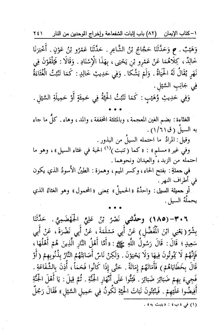 [184] فِي نهر الْحَيَاة أَو الحيا الشَّك من مَالك وَرِوَايَة غَيره الْحَيَاة بِالتَّاءِ من غير شكّ والحيا بِالْقصرِ الْمَطَر لِأَنَّهُ يحيي بِهِ الأَرْض الغثاءة بِضَم الْغَيْن الْمُعْجَمَة وبالمثلثة المخففة وَالْمدّ وهاء كل مَا جَاءَ بِهِ السَّيْل وَقيل المُرَاد مَا احتمله السَّيْل من البذور وَفِي غير مُسلم كَمَا تنْبت الْحبَّة فِي غثاء السَّيْل وَهُوَ مَا احتمله من الزّبد والعيدان وَنَحْوهمَا فِي حمئة بِفَتْح الْحَاء وَكسر الْمِيم وهمزة الطين الْأسود الَّذِي يكون فِي أَطْرَاف النَّهر أَو حميلة السَّيْل واحده الْحميل بِمَعْنى الْمَحْمُول وَهُوَ الغثاء الَّذِي يحملهُ السَّيْل