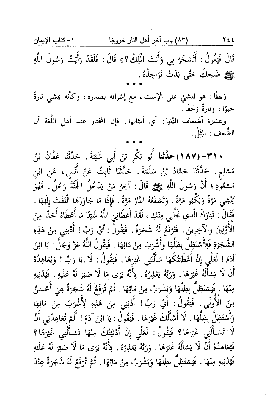 [186] حبوا هُوَ الْمَشْي على الْيَدَيْنِ وَالرّجلَيْنِ أَو الرُّكْبَتَيْنِ أَتسخر بِي أَو أتضحك بِي شكّ من الرَّاوِي وَهَذَا القَوْل صدر من قَائِله دهشا لما غَلبه من الْفَرح وسخر يتَعَدَّى بِالْبَاء على معنى هزأ أَو بِمن وَهُوَ الْأَفْصَح نَوَاجِذه بِالْجِيم والذال الْمُعْجَمَة الأنياب وَقيل الأضراس زحفا هُوَ الْمَشْي على الإست مَعَ إشرافه بصدره وَكَأَنَّهُ يمشي تَارَة حبوا وَتارَة زحفا وَعشرَة أَضْعَاف الدُّنْيَا أَي أَمْثَالهَا فَإِن الْمُخْتَار عِنْد أهل اللُّغَة أَن الضعْف الْمثل