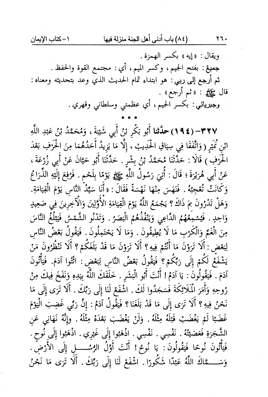 [193] فَيَهْتَمُّونَ أَي يعتنون بسؤال الشَّفَاعَة فيلهمون أَي يلهمهم الله تَعَالَى سُؤال ذَلِك قَالَ النَّوَوِيّ والإلهام أَن يلقى الله تَعَالَى فِي النَّفس أمرا يحمل على فعل الشَّيْء أَو تَركه خلقك الله بِيَدِهِ وَنفخ فِيك من روحه هَذَا من بَاب إِضَافَة التشريف لست هُنَاكُم أَي لست أَهلا لذَلِك ائْتُوا نوحًا أول رَسُول قَالَ الْمَازرِيّ إِن صَحَّ دَلِيل على أَن إِدْرِيس أرسل لم يَصح قَول النسابين إِنَّه قبل نوح لهَذَا الحَدِيث وَإِن لم يقم دَلِيل جَازَ مَا قَالُوهُ وَحمل على أَنه نَبِي مُرْسل قَالَ القَاضِي وَلَا يرد على الحَدِيث رِسَالَة آدم وشيث لِأَنَّهُ أرسل إِلَى بنيه وَلم يَكُونُوا كفَّارًا بل أَمر بتبليغهم الْإِيمَان وَطَاعَة الله وَكَذَلِكَ خَلفه شِيث بعده فيهم بِخِلَاف رِسَالَة نوح إِلَى كفار أهل الأَرْض اتَّخذهُ الله خَلِيلًا أصل الْخلَّة الِاخْتِصَاص والاصطفاء وَقيل الِانْقِطَاع إِلَى من خاللت من الْخلَّة وَهِي الْحَاجة فَسُمي إِبْرَاهِيم بذلك لِأَنَّهُ قصر حَاجته على ربه سُبْحَانَهُ وَقيل الْخلَّة صفاء الْمَوَدَّة لِأَنَّهَا توجب تخَلّل الْأَسْرَار وَقيل مَعْنَاهُ الْمحبَّة والألطاف الَّذِي كَلمه الله قَالَ النَّوَوِيّ صفة الْكَلَام ثابته لله تَعَالَى لَا تشبه كَلَام غَيره غفر الله مَا تقدم من ذَنبه وَمَا تَأَخّر هُوَ كِنَايَة عَن عصمته وتبرئته لَهُ من الذُّنُوب وَقعت سَاجِدا إِلَى آخِره فِي مُسْند أَحْمد أَنه يسْجد قدر جُمُعَة من جمع الدُّنْيَا أَي وَجب عَلَيْهِ الخلود هم الْكفَّار قَالَ تَعَالَى وَمَا هم بِخَارِجِينَ من النَّار ثمَّ آتيه أَي أَعُود إِلَى الْمقَام الَّذِي قُمْت فِيهِ أَولا وَسَأَلت صَاحب الدستوَائي أَي بِفَتْح الدَّال وَإِسْكَان السِّين الْمُهْمَلَتَيْنِ والمثناة الْفَوْقِيَّة وَبعد الْألف يَاء النِّسْبَة من غير نون وَمِنْهُم من يزِيد فِيهِ نونا بَين الْألف وَالْيَاء نِسْبَة إِلَى دستوى كورة من كور الأهواز كَانَ يَبِيع الثِّيَاب الَّتِي تجلب مِنْهَا فنسب إِلَيْهَا فَيُقَال هِشَام الدستوَائي وَهِشَام صَاحب الدستوَائي أَي صَاحب الْبَز الدستوَائي مَا يزن أَي يعدل ذرة بِفَتْح الذَّال الْمُعْجَمَة وَتَشْديد الرَّاء وَاحِدَة الذَّر وَهُوَ الْحَيَوَان الصَّغِير من النَّمْل إِلَّا أَن شُعْبَة جعل مَكَان الذّرة ذرة يَعْنِي بِضَم الذَّال وَتَخْفِيف الرَّاء صحف فِيهَا أَبُو بسطَام هِيَ كنية شُعْبَة فأحمده بِمَحَامِد لَا أقدر عَلَيْهِ قَالَ النَّوَوِيّ كَذَا فِي الْأُصُول وَالضَّمِير عَائِد إِلَى الْحَمد فَأخْرجهُ كَذَا فِي بعض الْأُصُول فِي الأول خطابا لَهُ صلى الله عَلَيْهِ وَسلم وَفِي بَعْضهَا فأخرجوه خطابا لَهُ وَلمن مَعَه من الْمَلَائِكَة وَفِي بَعْضهَا فأخرجوا بِحَذْف الْمَفْعُول أما الثَّانِي وَالثَّالِث فاتفقت الْأُصُول على فَأخْرجهُ بِظهْر الجبان بِفَتْح الْجِيم وَتَشْديد الْبَاء الصَّحرَاء وَتسَمى بهَا الْمَقَابِر لِأَنَّهَا تكون فِيهَا فَهُوَ من بَاب تَسْمِيَة الشَّيْء باسم مَوْضِعه أَي بظاهرها وأعلاها والمرتفع مِنْهَا وَهُوَ مستخف أَي متغيب خوفًا من الْحجَّاج هيه بِكَسْر الهائين وَسُكُون التَّحْتِيَّة بَينهمَا اسْم فعل يُقَال فِي استزادة الحَدِيث وَيُقَال إيه بِكَسْر الْهمزَة جَمِيع بِفَتْح الْجِيم وَكسر الْمِيم أَي مُجْتَمع الْقُوَّة وَالْحِفْظ ثمَّ أرجع إِلَى رَبِّي هُوَ ابْتِدَاء تَمام الحَدِيث الَّذِي وعد بتحديثه وَمَعْنَاهُ قَالَ رَسُول الله صلى الله عَلَيْهِ وَسلم ثمَّ أرجع وجبريائي بِكَسْر الْجِيم أَي عظمتي وسلطاني وقهري