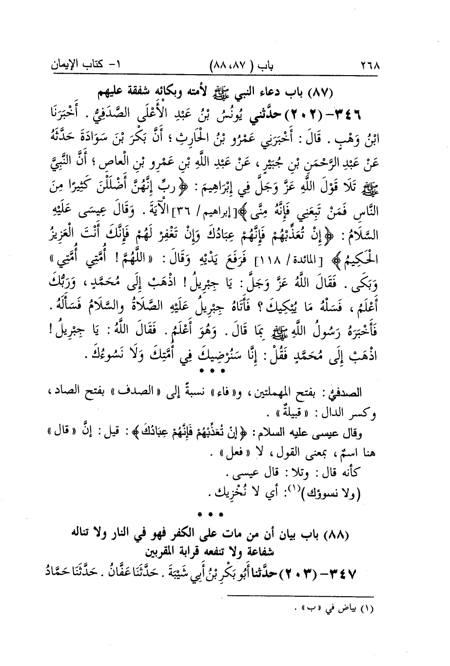 [202] الصَّدَفِي بِفَتْح الْمُهْمَلَتَيْنِ وَفَاء نِسْبَة إِلَى الصدف بِفَتْح الصَّاد وَكسر الدَّال قَبيلَة وَقَالَ عِيسَى عَلَيْهِ السَّلَام إِن تُعَذبهُمْ فَإِنَّهُم عِبَادك قيل إِن قَالَ هُنَا اسْم بِمَعْنى القَوْل لَا فعل كَأَنَّهُ قَالَ وتلا قَالَ عِيسَى وَلَا نسوؤك أَي لَا نخزيك