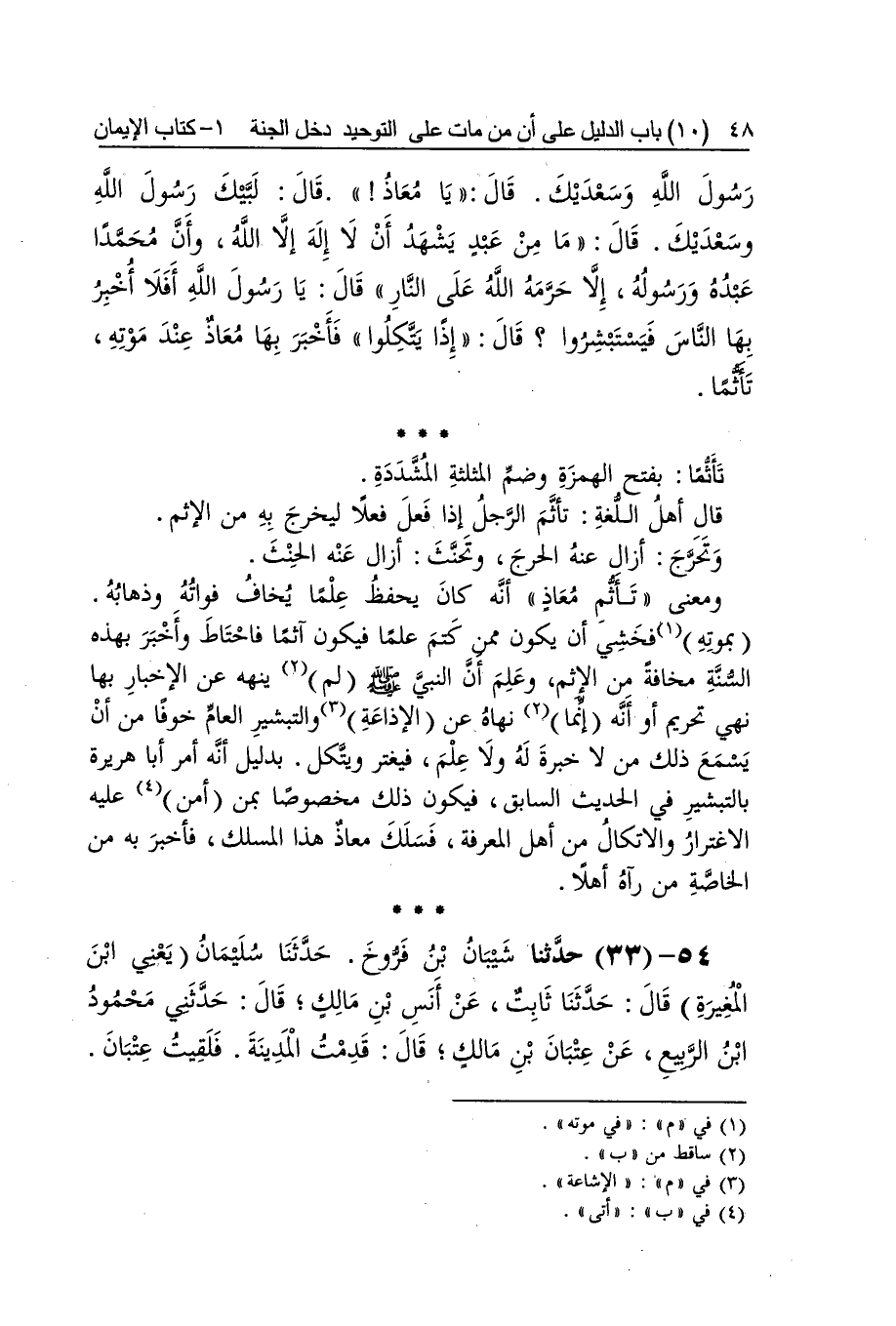 [32] تأثما بِفَتْح الْهمزَة وَضم الْمُثَلَّثَة الْمُشَدّدَة قَالَ أهل اللُّغَة تأثم الرجل إِذا فعل فعلا ليخرج بِهِ من الْإِثْم وتحرج أَزَال عَنهُ الْحَرج وتحنث أَزَال عَنهُ الْحِنْث وَمعنى تأثم معَاذ أَنه كَانَ يحفظ علما يخَاف فَوَاته وذهابه بِمَوْتِهِ فخشي أَن يكون مِمَّن كتم علما فَيكون آثِما فاحتاط وَأخْبر بِهَذِهِ السّنة مَخَافَة من الْإِثْم وَعلم أَن النَّبِي صلى الله عَلَيْهِ وَسلم لم يَنْهَهُ عَن الْإِخْبَار بهَا نهي تَحْرِيم أَو أَنه إِنَّمَا نَهَاهُ عَن الإذاعة والتبشير الْعَام خوفًا من أَن يسمع ذَلِك من لَا خبْرَة لَهُ وَلَا علم فيغتر ويتكل بِدَلِيل أَنه أَمر أَبَا هُرَيْرَة بالتبشير فِي الحَدِيث السَّابِق فَيكون ذَلِك مَخْصُوصًا بِمن أَمن عَلَيْهِ الاغترار والاتكال من أهل الْمعرفَة فسلك معَاذ هَذَا المسلك فَأخْبر بِهِ من الْخَاصَّة من رَآهُ أَهلا
