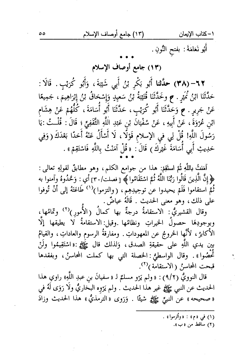 [37] ثَنَا مُحَمَّد بن الْمثنى هَذَا الْإِسْنَاد وَالَّذِي بعده رجالهما كلهم بصريون أما السوار بِفَتْح السِّين وَتَشْديد الْوَاو وَآخره رَاء الْحيَاء لَا يَأْتِي إِلَّا بِخَير اسْتشْكل من حَيْثُ أَن صَاحب الْحيَاء قد يستحيي أَن يواجه بِالْحَقِّ من لَا يَفْعَله فَيتْرك أمره بِالْمَعْرُوفِ وَنَهْيه عَن الْمُنكر وَقد يحملهُ الْحيَاء عَن الْإِخْلَال بِبَعْض الْحُقُوق وَغير ذَلِك مِمَّا هُوَ مَعْرُوف فِي الْعَادة وَأجَاب بن الصّلاح وَغَيره بِأَن هَذَا الْمَانِع لَيْسَ بحياء حَقِيقَة بل هُوَ عجز وخور ومهانة وَإِنَّمَا يُطلق عَلَيْهِ أهل الْعرف حَيَاء مجَازًا لمشابهته الْحيَاء الْحَقِيقِيّ وَحَقِيقَة الْحيَاء خلق يبْعَث على ترك الْقَبِيح وَيمْنَع من التَّقْصِير فِي حق ذِي الْحق بشير بن كَعْب بِضَم الْبَاء وَفتح الْمُعْجَمَة ضعف بِالْفَتْح وَالضَّم حَتَّى احمرتا عَيناهُ كَذَا فِي الْأُصُول وَهُوَ جَار على لُغَة أكلوني البراغيث وَفِي سنَن أبي دَاوُد احْمَرَّتْ بِلَا ألف وَهُوَ أدل دَلِيل على أَن ذَلِك تعبيرات الروَاة وتعارض فِيهِ أَي تَأتي بِكَلَام فِي مُقَابلَته وتعترض بِمَا يُخَالِفهُ إِنَّه منا أَي لَيْسَ مِمَّن يتهم بِنفَاق أَو زندقة أَو بِدعَة يَا أَبَا نجيد بِضَم النُّون وَفتح الْجِيم آخِره دَال مُهْملَة كنية عمرَان بن حُصَيْن رَضِي الله عَنهُ أَبُو نعَامَة بِفَتْح النُّون