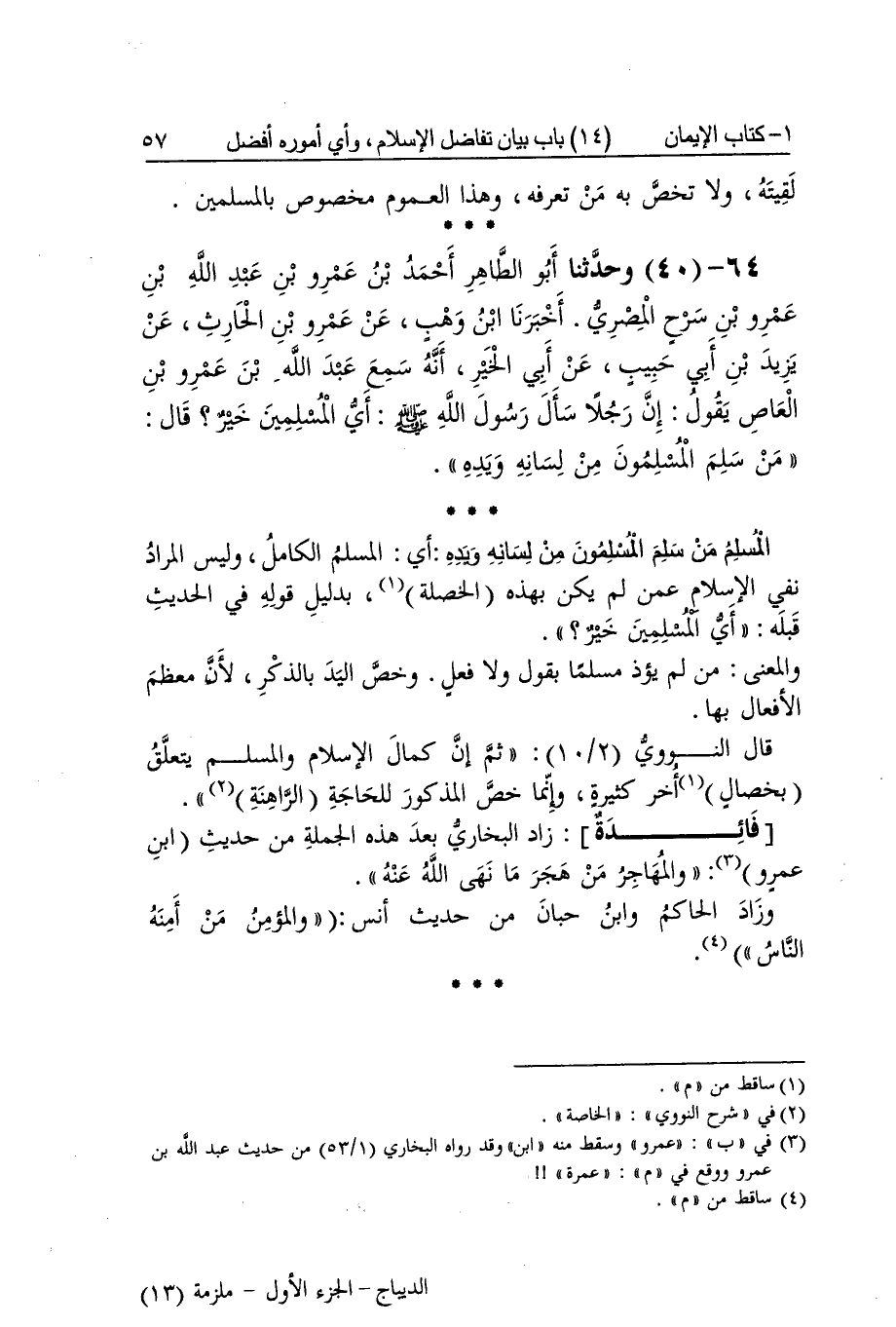 [39] وَحدثنَا مُحَمَّد بن رمح هَذَا الْإِسْنَاد وَالَّذِي بعده رِجَالهمْ كلهم مصريون أَئِمَّة أجلة قَالَ النَّوَوِيّ وَهَذَا من عَزِيز الْأَسَانِيد فِي مُسلم بل وَفِي غَيره فَإِن اتِّفَاق جَمِيع الروَاة فِي كَونهم مصريين فِي غَايَة الْقلَّة ويزداد قلَّة بِاعْتِبَار الْعَدَالَة أَي الْإِسْلَام خير أَي خصاله أَي أُمُوره وأحواله وَإِنَّمَا وَقع اخْتِلَاف الْجَواب فِي خير الْمُسلمين لاخْتِلَاف حَال السَّائِلين أَو الْحَاضِرين وَكَانَ فِي أحد الْمَوْضِعَيْنِ الْحَاجة إِلَى إفشاء السَّلَام وإطعام الطَّعَام أَكثر وأهم لما حصل من إهمالهما والتساهل فِي أَمرهمَا أَو نَحْو ذَلِك وَفِي الْموضع الآخر الْكَفّ عَن إِيذَاء الْمُسلمين وتقرأ السَّلَام على من عرفت وَمن لم تعرف أَي تسلم على كل من لَقيته وَلَا تخص بِهِ من تعرفه وَهَذَا الْعُمُوم مَخْصُوص بِالْمُسْلِمين
