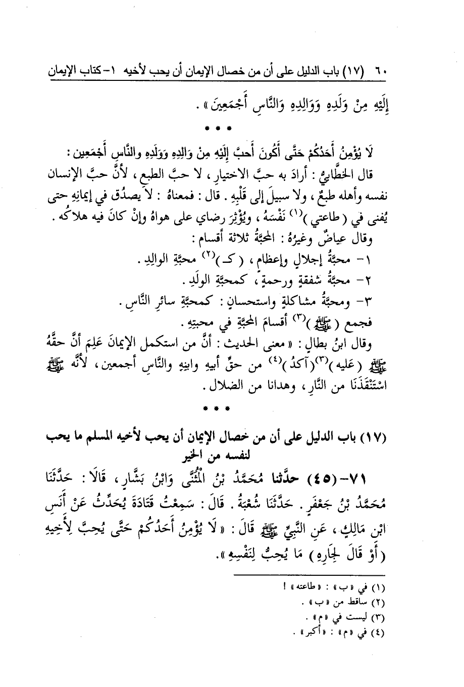 [44] شَيبَان بن أبي شيبَة هُوَ بن فروخ لَا يُؤمن أحدكُم حَتَّى أكون أحب إِلَيْهِ من وَالِده وَولده وَالنَّاس أَجْمَعِينَ قَالَ الْخطابِيّ أَرَادَ بِهِ حب الِاخْتِيَار لَا حب الطَّبْع لِأَن حب الْإِنْسَان نَفسه وَأَهله طبع وَلَا سَبِيل إِلَى قلبه قَالَ فَمَعْنَاه لَا يصدق فِي إيمَانه حَتَّى يفنى فِي طَاعَتي نَفسه ويؤثر رضاي على هَوَاهُ وَإِن كَانَ فِيهِ هَلَاكه وَقَالَ عِيَاض وَغَيره الْمحبَّة ثَلَاثَة أَقسَام 1 محبَّة إجلال وإعظام ك محبَّة الْوَالِد 2 محبَّة شَفَقَة وَرَحْمَة كمحبة الْوَلَد 3 ومحبة مشاكلة واستحسان كمحبة سَائِر النَّاس فَجمع صلى الله عَلَيْهِ وَسلم أَقسَام الْمحبَّة فِي محبته وَقَالَ بن بطال معنى الحَدِيث أَن من اسْتكْمل الْإِيمَان علم أَن حَقه صلى الله عَلَيْهِ وَسلم عَلَيْهِ آكِد من حق أَبِيه وَابْنه وَالنَّاس أَجْمَعِينَ لِأَنَّهُ صلى الله عَلَيْهِ وَسلم استنقذنا من النَّار وهدانا من الضلال