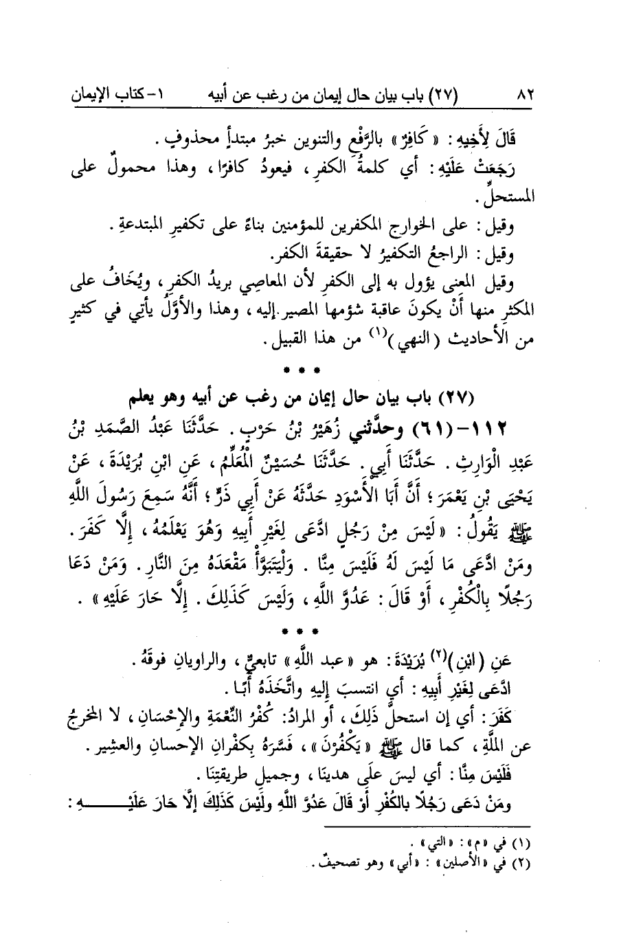 [60] بَاء بهَا أَي رَجَعَ بِكَلِمَة الْكفْر قَالَ لِأَخِيهِ كَافِر بِالرَّفْع والتنوين خبر مُبْتَدأ مَحْذُوف رجعت عَلَيْهِ أَي كلمة الْكفْر فَيَعُود كَافِرًا وَهَذَا مَحْمُول على المستحل وَقيل على الْخَوَارِج المكفرين للْمُؤْمِنين بِنَاء على تَكْفِير المبتدعة وَقيل الرَّاجِع التَّكْفِير لَا حَقِيقَة الْكفْر وَقيل الْمَعْنى يؤول بِهِ إِلَى الْكفْر لِأَن الْمعاصِي بريد الْكفْر وَيخَاف على المكثر مِنْهَا أَن يكون عَاقِبَة شؤمها الْمصير إِلَيْهِ وَهَذَا وَالْأول يَأْتِي فِي كثير من الْأَحَادِيث النَّهْي من هَذَا الْقَبِيل