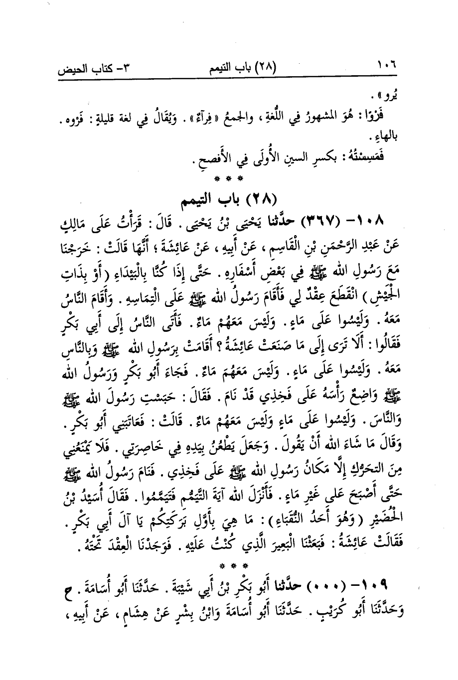 [366] وَعلة بِفَتْح الْوَاو وَإِسْكَان الْمُهْملَة السبإي بِفَتْح الْمُهْملَة وَالْمُوَحَّدَة ثمَّ همزَة ثمَّ يَاء النِّسْبَة يَعْنِي حَدِيث يحيى بن يحيى بِالْيَاءِ فِي يَعْنِي من كَلَام الرَّاوِي عَن مُسلم قَالَ النَّوَوِيّ وَلَو رُوِيَ بالنُّون على أَنه من كَلَام مُسلم لَكَانَ حسنا وَلَكِن لم يرو فروا هُوَ الْمَشْهُور فِي اللُّغَة وَالْجمع فراء وَيُقَال فِي لُغَة قَليلَة فروه بِالْهَاءِ فمسسته بِكَسْر السِّين الأولى فِي الْأَفْصَح