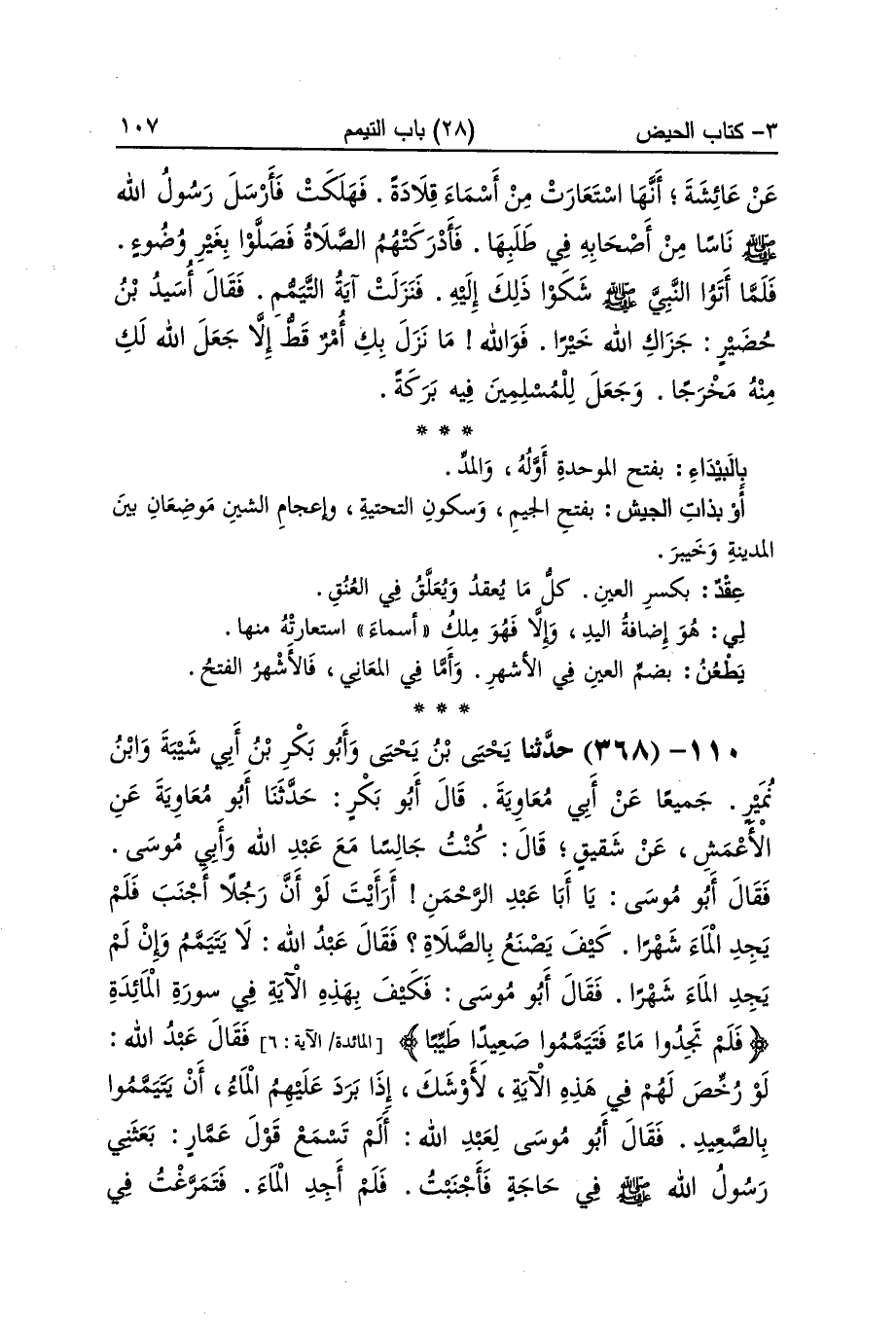 [367] بِالْبَيْدَاءِ بِفَتْح الْمُوَحدَة أَوله وَالْمدّ أَو بِذَات الْجَيْش بِفَتْح الْجِيم وَسُكُون التَّحْتِيَّة وإعجام الشين موضعان بَين الْمَدِينَة وخيبر عقد بِكَسْر الْعين كل مَا يعْقد ويعلق فِي الْعُنُق لي هُوَ إِضَافَة الْيَد وَإِلَّا فَهُوَ ملك أَسمَاء استعارته مِنْهَا يطعن بِضَم الْعين فِي الْأَشْهر وَأما فِي الْمعَانِي فالأشهر الْفَتْح