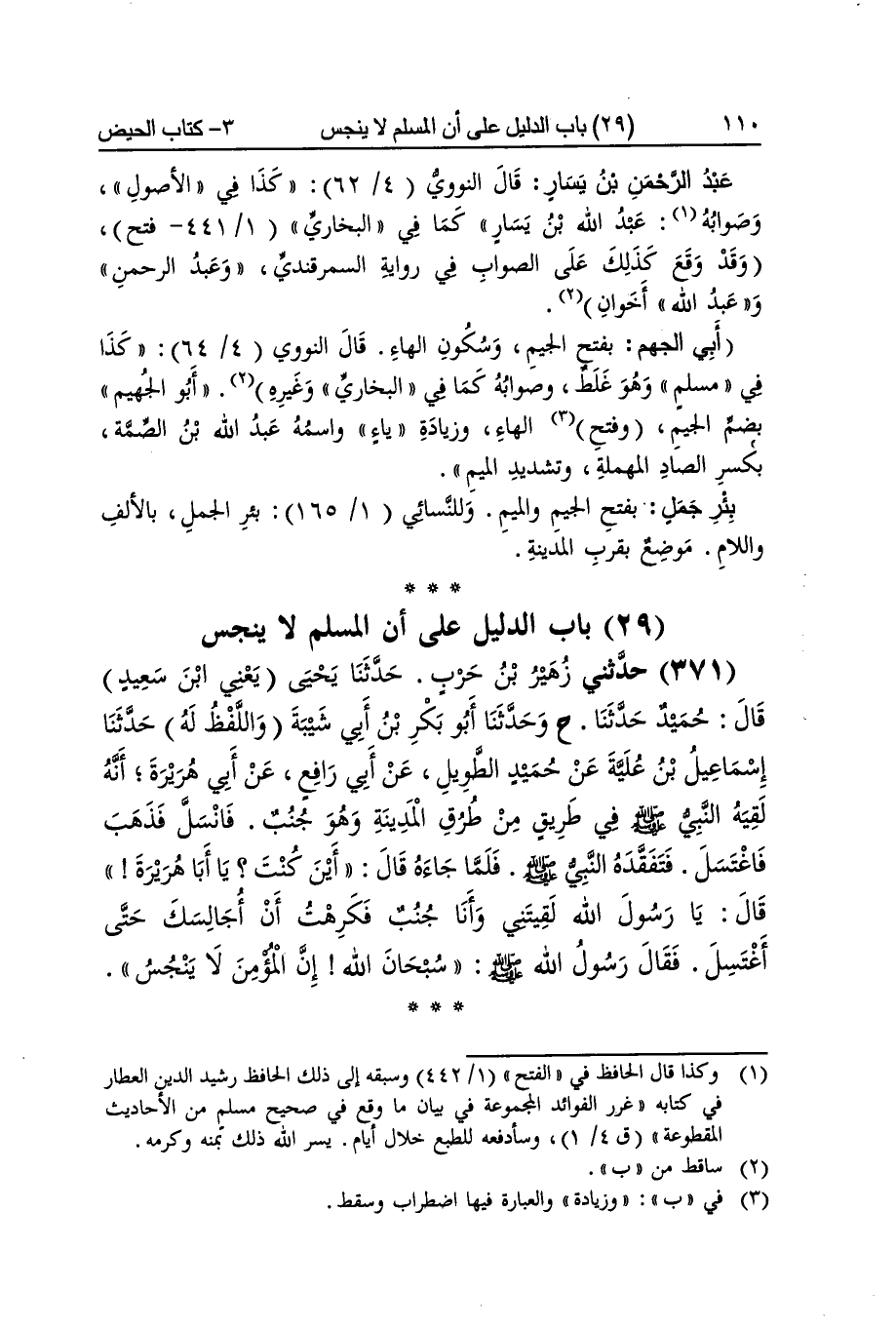 [369] وروى اللَّيْث هَذَا مُعَلّق وَهُوَ مَوْصُول فِي البُخَارِيّ عبد الرَّحْمَن بن يسَار قَالَ النَّوَوِيّ كَذَا فِي الْأُصُول وَصَوَابه عبد الله بن يسَار كَمَا فِي البُخَارِيّ فتح وَقد وَقع كَذَلِك على الصَّوَاب فِي رِوَايَة السَّمرقَنْدِي وَعبد الرَّحْمَن وَعبد الله أَخَوان أبي الجهم بِفَتْح الْجِيم وَسُكُون الْهَاء قَالَ النَّوَوِيّ كَذَا فِي مُسلم وَهُوَ غلط وَصَوَابه كَمَا فِي البُخَارِيّ وَغَيره أَبُو الْجُهَيْم بِضَم الْجِيم وَفتح الْهَاء وَزِيَادَة يَاء واسْمه عبد الله بن الصمَّة بِكَسْر الصَّاد الْمُهْملَة وَتَشْديد الْمِيم بِئْر جمل بِفَتْح الْجِيم وَالْمِيم وللنسائي بِئْر الْجمل بِالْألف وَاللَّام مَوضِع بِقرب الْمَدِينَة