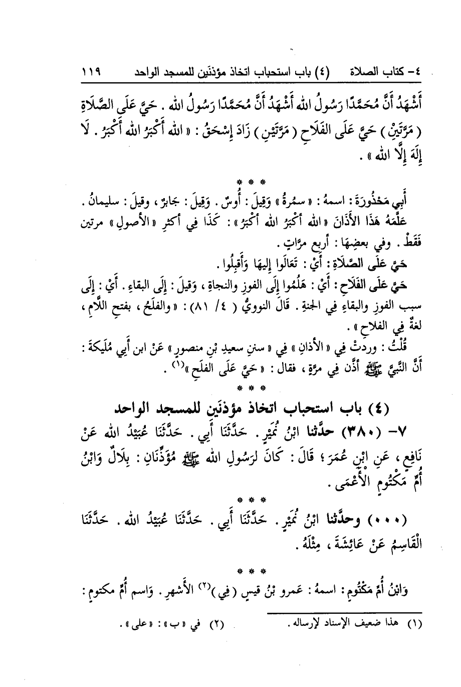 [379] أبي مَحْذُورَة اسْمه سَمُرَة وَقيل أَوْس وَقيل جَابر وَقيل سُلَيْمَان علمه هَذَا الْأَذَان الله أكبر الله أكبر كَذَا فِي أَكثر الْأُصُول مرَّتَيْنِ فَقَط وَفِي بَعْضهَا أَربع مَرَّات حَيّ على الصَّلَاة أَي تَعَالَوْا إِلَيْهَا وَأَقْبلُوا حَيّ على الْفَلاح أَي هلموا إِلَى الْفَوْز والنجاة وَقيل إِلَى الْبَقَاء أَي إِلَى سَبَب الْفَوْز والبقاء فِي الْجنَّة قَالَ النَّوَوِيّ والفلح بِفَتْح اللَّام لُغَة فِي الْفَلاح قلت وَردت فِي الْأَذَان فِي سنَن سعيد بن مَنْصُور عَن بن أبي مليكَة أَن النَّبِي صلى الله عَلَيْهِ وَسلم أذن فِي مرّة فَقَالَ حَيّ على الفلح