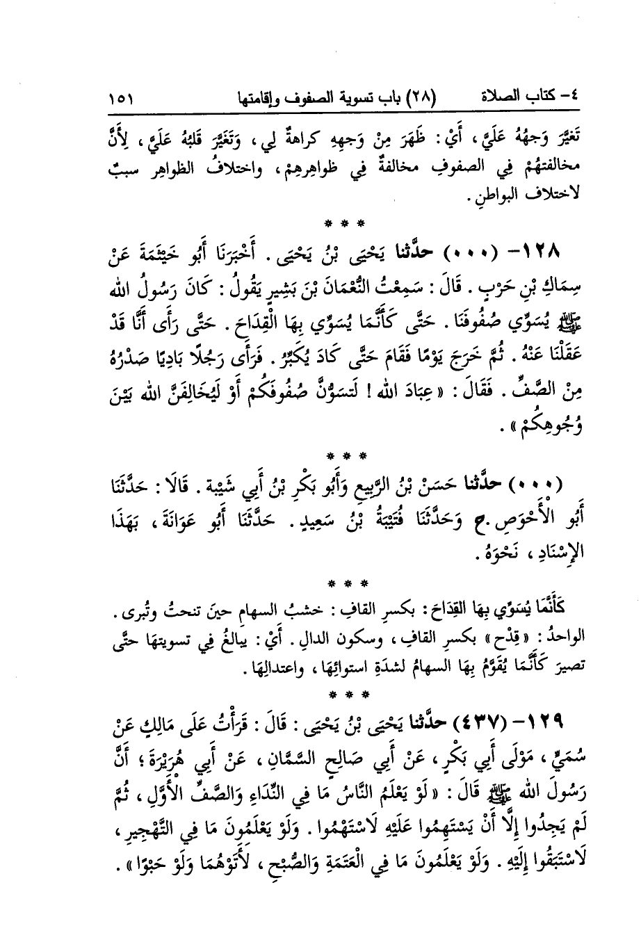 [436] ليخالفن الله بَين وُجُوهكُم أَي يمسخها ويحولها عَن صورها وَقيل يُوقع بَيْنكُم الْعَدَاوَة والبغضاء وَاخْتِلَاف الْقُلُوب كَمَا يُقَال تغير وَجهه عَليّ أَي ظهر من وَجهه كَرَاهَة لي وَتغَير قلبه عَليّ لِأَن مخالفتهم فِي الصُّفُوف مُخَالفَة فِي ظواهرهم وَاخْتِلَاف الظَّوَاهِر سَبَب لاخْتِلَاف البواطن كَأَنَّمَا يُسَوِّي بهَا القداح بِكَسْر الْقَاف خشب السِّهَام حِين تنحت وتبرى الْوَاحِد قدح بِكَسْر الْقَاف وَسُكُون الدَّال أَي يُبَالغ فِي تسويتها حَتَّى تصير كَأَنَّمَا يقوم بهَا السِّهَام لشدَّة استوائها واعتدالها