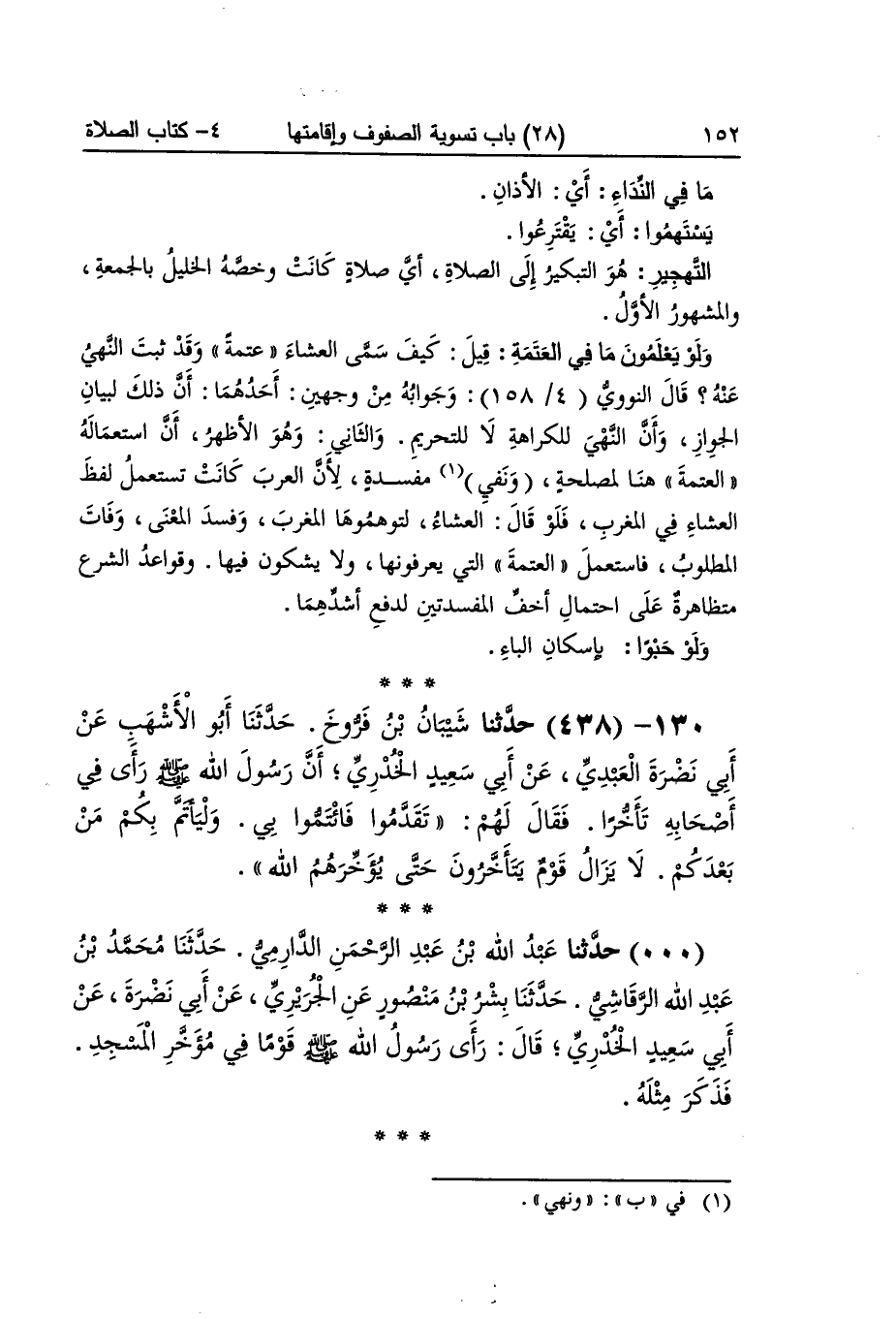 [437] مَا فِي النداء أَي الْأَذَان يستهموا أَي يقترعوا التهجير هُوَ التَّكْبِير إِلَى الصَّلَاة أَي صَلَاة كَانَت وَخَصه الْخَلِيل بِالْجمعَةِ وَالْمَشْهُور الأول وَلَو يعلمُونَ مَا فِي الْعَتَمَة قيل كَيفَ سمى الْعشَاء عتمة وَقد ثَبت النَّهْي عَنهُ قَالَ النَّوَوِيّ وَجَوَابه من وَجْهَيْن أَحدهمَا أَن ذَلِك لبَيَان الْجَوَاز وَأَن النَّهْي للكراهة لَا للتَّحْرِيم وَالثَّانِي وَهُوَ الأظهرأن اسْتِعْمَاله الْعَتَمَة هُنَا لمصْلحَة وَنفي مفْسدَة لِأَن الْعَرَب كَانَت تسْتَعْمل لفظ الْعشَاء فِي الْمغرب فَلَو قَالَ الْعشَاء لتوهموها الْمغرب وَفَسَد الْمَعْنى وَفَاتَ الْمَطْلُوب فَاسْتعْمل الْعَتَمَة الَّتِي يعرفونها وَلَا يَشكونَ فِيهَا وقواعد الشَّرْع متظاهرة على احْتِمَال أخف المفسدتين لدفع أشدهما وَلَو حبوا بِإِسْكَان الْبَاء