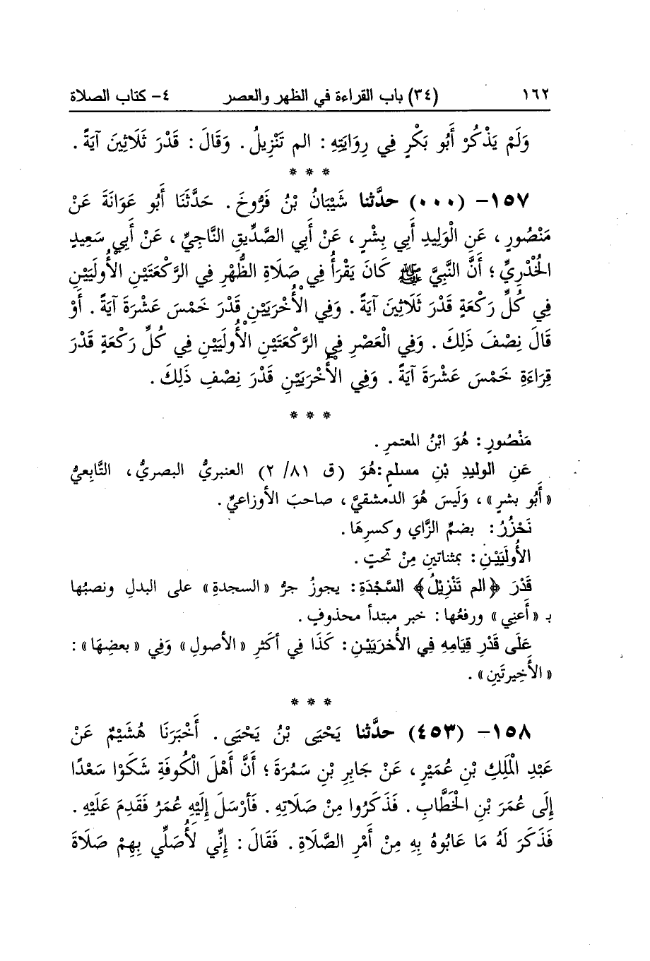 [452] مَنْصُور هُوَ بن الْمُعْتَمِر عَن الْوَلِيد بن مُسلم هُوَ الْعَنْبَري الْبَصْرِيّ التَّابِعِيّ أَبُو بشر وَلَيْسَ هُوَ الدِّمَشْقِي صَاحب الْأَوْزَاعِيّ نحزر بِضَم الزَّاي وَكسرهَا الْأَوليين بمثناتين من تَحت قدر ألم تَنْزِيل السَّجْدَة يجوز جر السَّجْدَة على الْبَدَل ونصبها أَعنِي ورفعها خبر مُبْتَدأ مَحْذُوف على قدر قِيَامه فِي الْأُخْرَيَيْنِ كَذَا فِي أَكثر الْأُصُول وَفِي بَعْضهَا الْأَخِيرَتَيْنِ