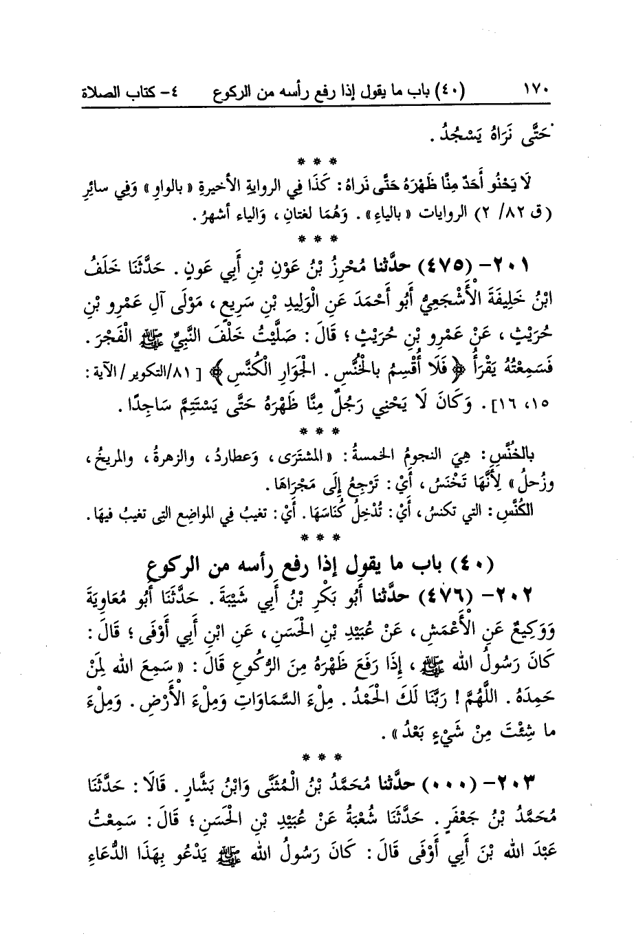 [475] بالخنس هِيَ النُّجُوم الْخَمْسَة الْمُشْتَرى وَعُطَارِد والزهرة والمريخ وزحل لِأَنَّهَا تخنس أَي ترجع إِلَى مجْراهَا الكنس الَّتِي تكنس أَي تدخل كناسها أَي تغيب فِي الْمَوَاضِع الَّتِي تغيب فِيهَا