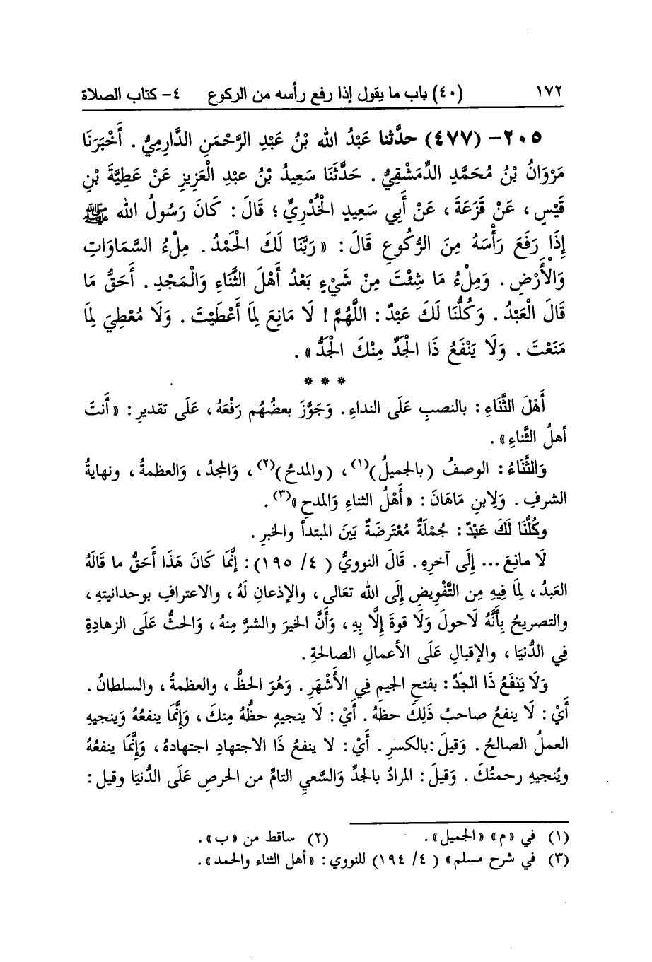 [476] ملْء السَّمَاوَات بِالنّصب وَالرَّفْع وَالنّصب أشهر أَي حمدا لَو كَانَ جسما لملأ السَّمَاوَات مجزأَة بِفَتْح الْمِيم وَقد تكسر وَسُكُون الْجِيم وزاي وهمزة وَقد تسهل اللَّهُمَّ طهرني بالثلج وَالْبرد وَمَاء الْبَارِد اسْتِعَارَة للْمُبَالَغَة فِي الطَّهَارَة من الذُّنُوب وَغَيرهَا وَمَاء الْبَارِد من إِضَافَة الْمَوْصُوف إِلَى صفته كمسجد الْجَامِع فيتقدر على رَأْي الْبَصرِيين مَاء الطّهُور الْبَارِد من الدَّرن هُوَ بِمَعْنى الْوَسخ