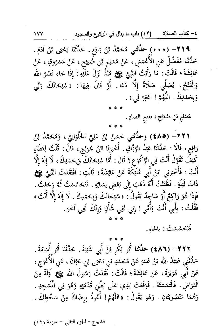 [484] يتَأَوَّل الْقُرْآن أَي يتَمَثَّل مَا أَمر بِهِ فِيهِ من قَوْله فسبح بِحَمْد رَبك وَاسْتَغْفرهُ النَّصْر قَالَ النَّوَوِيّ حَالَة الصَّلَاة أفضل من غَيرهَا فَكَانَ يختارها لأَدَاء هَذَا الْوَاجِب الَّذِي أَمر بِهِ ليَكُون أكمل وَقَوله اللَّهُمَّ اغْفِر لي مَعَ عصمته من بَاب العبودي والإذعان والافتقار إِلَى الله تَعَالَى مُسلم بن صبيح بِفَتْح الصَّاد