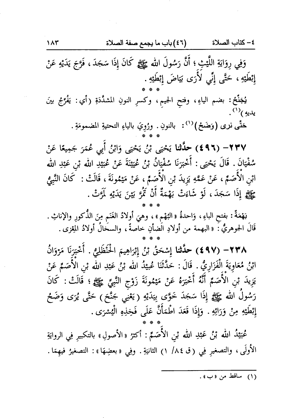[495] عبد الله بن مَالك بن بُحَيْنَة بتنوين مَالك وتكتب بن بِالْألف لِأَن بن بحتية صفة لعبد الله لَا لمَالِك وَهِي أم عبد الله فرج بَين يَدَيْهِ يَعْنِي بَين يَدَيْهِ وجنبيه يجنح بِضَم الْيَاء وَفتح الْجِيم وَكسر النُّون الْمُشَدّدَة أَي يفرج بَين يَدَيْهِ حَتَّى نرى وضح بالنُّون وَرُوِيَ بِالْيَاءِ التَّحْتِيَّة المضمومة