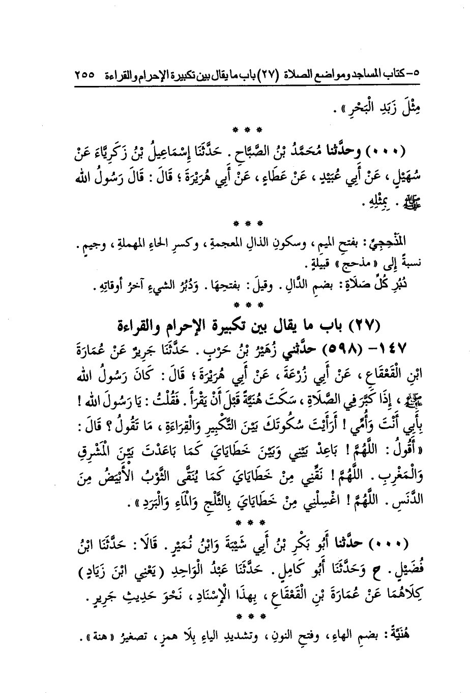 [597] الْمذْحِجِي بِفَتْح الْمِيم وَسُكُون الذَّال الْمُعْجَمَة وَكسر الْحَاء الْمُهْملَة وجيم نِسْبَة إِلَى مذْحج قَبيلَة دبر كل صَلَاة بِضَم الدَّال وَقيل بِفَتْحِهَا ودبر الشَّيْء آخر أوقاته