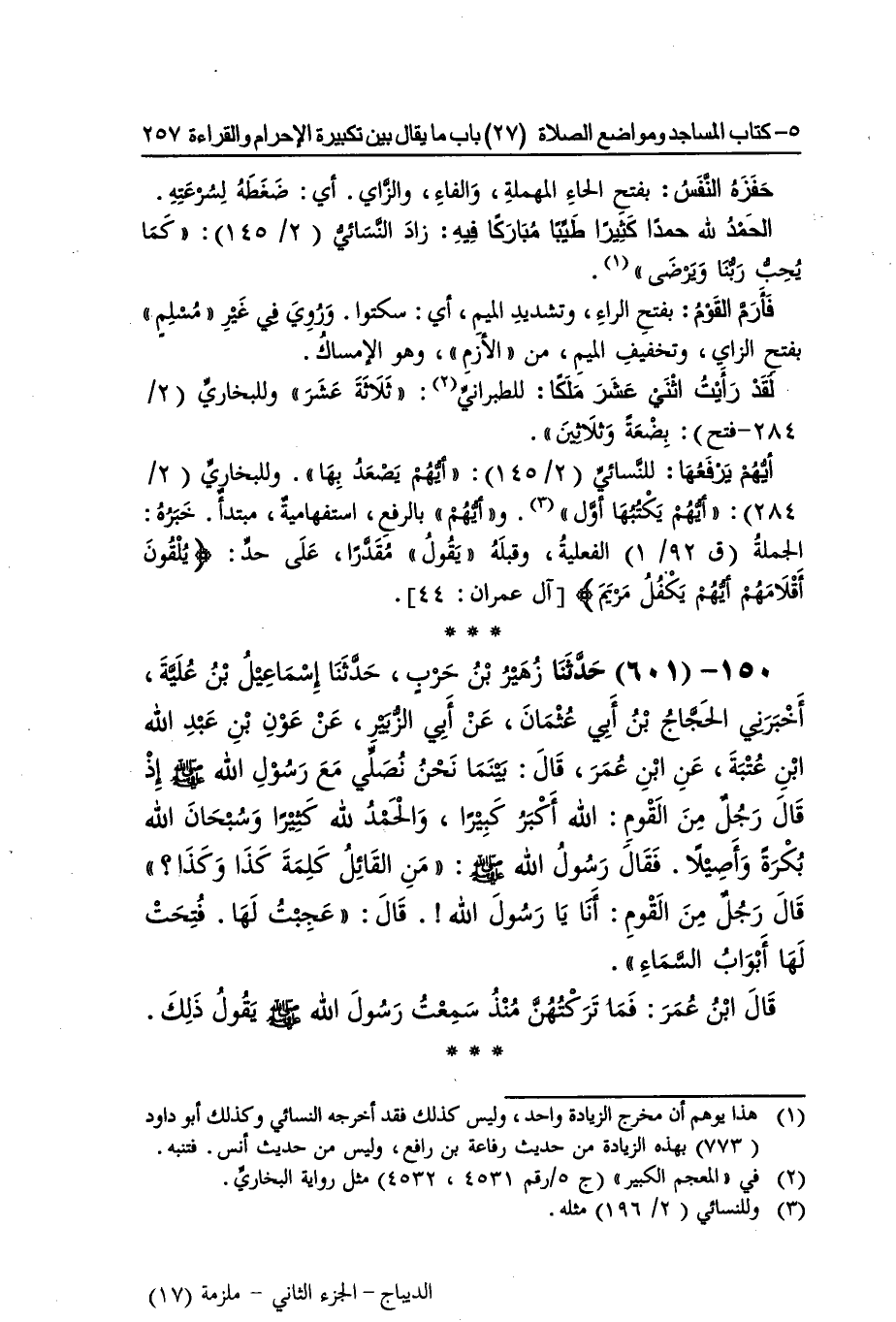 [600] أَن رجلا جَاءَ يدْخل فِي الصَّفّ هُوَ رِفَاعَة بن رَافع حفزه النَّفس بِفَتْح الْحَاء الْمُهْملَة وَالْفَاء وَالزَّاي أَي ضغطه لسرعته الْحَمد لله حمدا كثيرا طيبا مُبَارَكًا فِيهِ زَاد النَّسَائِيّ كَمَا يحب رَبنَا ويرضى فأرم الْقَوْم بِفَتْح الرَّاء وَتَشْديد الْمِيم أَي سكتوا وَرُوِيَ فِي غير مُسلم بِفَتْح الزَّاي وَتَخْفِيف الْمِيم من الأزم وَهُوَ الْإِمْسَاك لقد رَأَيْت اثْنَي عشر ملكا للطبراني ثَلَاثَة عشر وللبخاري بضعَة وَثَلَاثِينَ أَيهمْ يرفعها للنسائي أَيهمْ يصعد بهَا وللبخاري أَيهمْ يَكْتُبهَا أول وأيهم بِالرَّفْع استفهامية مُبْتَدأ خَبره الْجُمْلَة الفعلية وَقَبله يَقُول مُقَدرا على حد يلقون أقلامهم أَيهمْ يكفل مَرْيَم