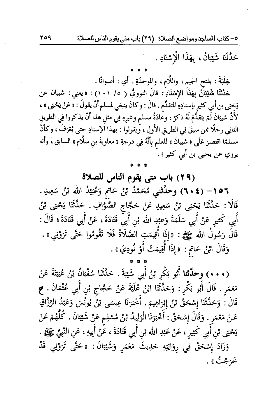 [603] جلبة بِفَتْح الْجِيم وَاللَّام وَالْمُوَحَّدَة أَي أصواتا حَدثنَا شَيبَان بِهَذَا الْإِسْنَاد قَالَ النَّوَوِيّ يَعْنِي شَيبَان عَن يحيى بن أبي كثير بِإِسْنَادِهِ الْمُتَقَدّم قَالَ وَكَانَ يَنْبَغِي لمُسلم أَن يَقُول عَن يحيى لِأَن شَيبَان لم يتَقَدَّم لَهُ ذكر وَعَادَة مُسلم وَغَيره فِي مثل هَذَا أَن يذكرُوا فِي الطَّرِيق الثَّانِي رجلا مِمَّن سبق فِي الطَّرِيق الأول ويقولوا بِهَذَا الْإِسْنَاد حَتَّى يعرف وَكَأن مُسلما اقْتصر على شَيبَان للْعلم بِأَنَّهُ فِي دَرَجَة مُعَاوِيَة بن سَلام السَّابِق وَأَنه يروي عَن يحيى بن أبي كثير