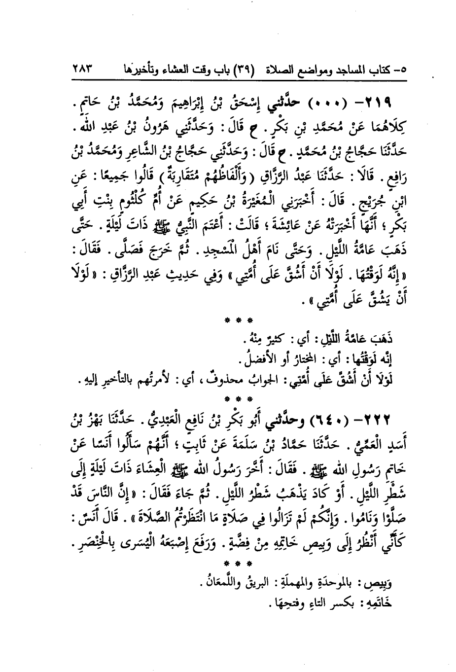 [638] عَمْرو بن سَواد بتَشْديد الْوَاو أعتم أَي أخر الْعشَاء حَتَّى اشتدت عتمة اللَّيْل وَهِي ظلمته أَن تنزروا بِفَتْح الْمُثَنَّاة الْفَوْقِيَّة وَسُكُون النُّون وَضم الزَّاي ثمَّ رَاء أَي تلحوا عَلَيْهِ وَضَبطه بَعضهم بِضَم أَوله ثمَّ بَاء مُوَحدَة ثمَّ رَاء مَكْسُورَة ثمَّ زَاي من الإبزاز وَهُوَ الْإِخْرَاج ذهب عَامَّة اللَّيْل أَي كثير مِنْهُ إِنَّه لوَقْتهَا أَي الْمُخْتَار أَو الْأَفْضَل لَوْلَا أَن أشق على أمتِي الْجَواب مَحْذُوف أَي لأمرتهم بِالتَّأْخِيرِ إِلَيْهِ