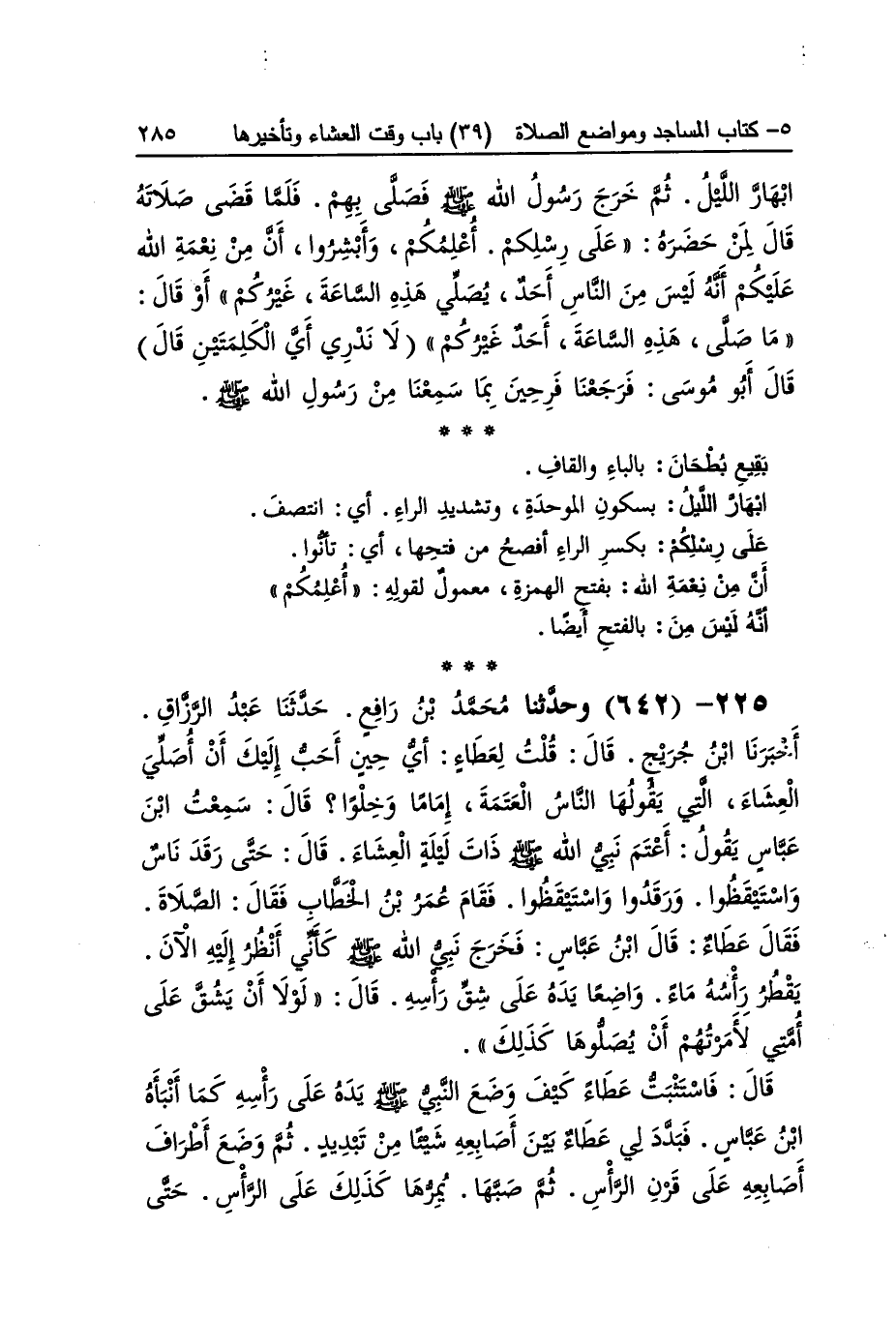 [641] بَقِيع بطحان بِالْبَاء وَالْقَاف ابهار اللَّيْل بِسُكُون الْمُوَحدَة وَتَشْديد الرَّاء أَي انتصف على رسلكُمْ بِكَسْر الرَّاء أفْصح من فتحهَا أَي تأنوا إِن من نعْمَة الله بِفَتْح الْهمزَة مَعْمُول لقَوْله أعلمكُم إِنَّه لَيْسَ من بِالْفَتْح أَيْضا
