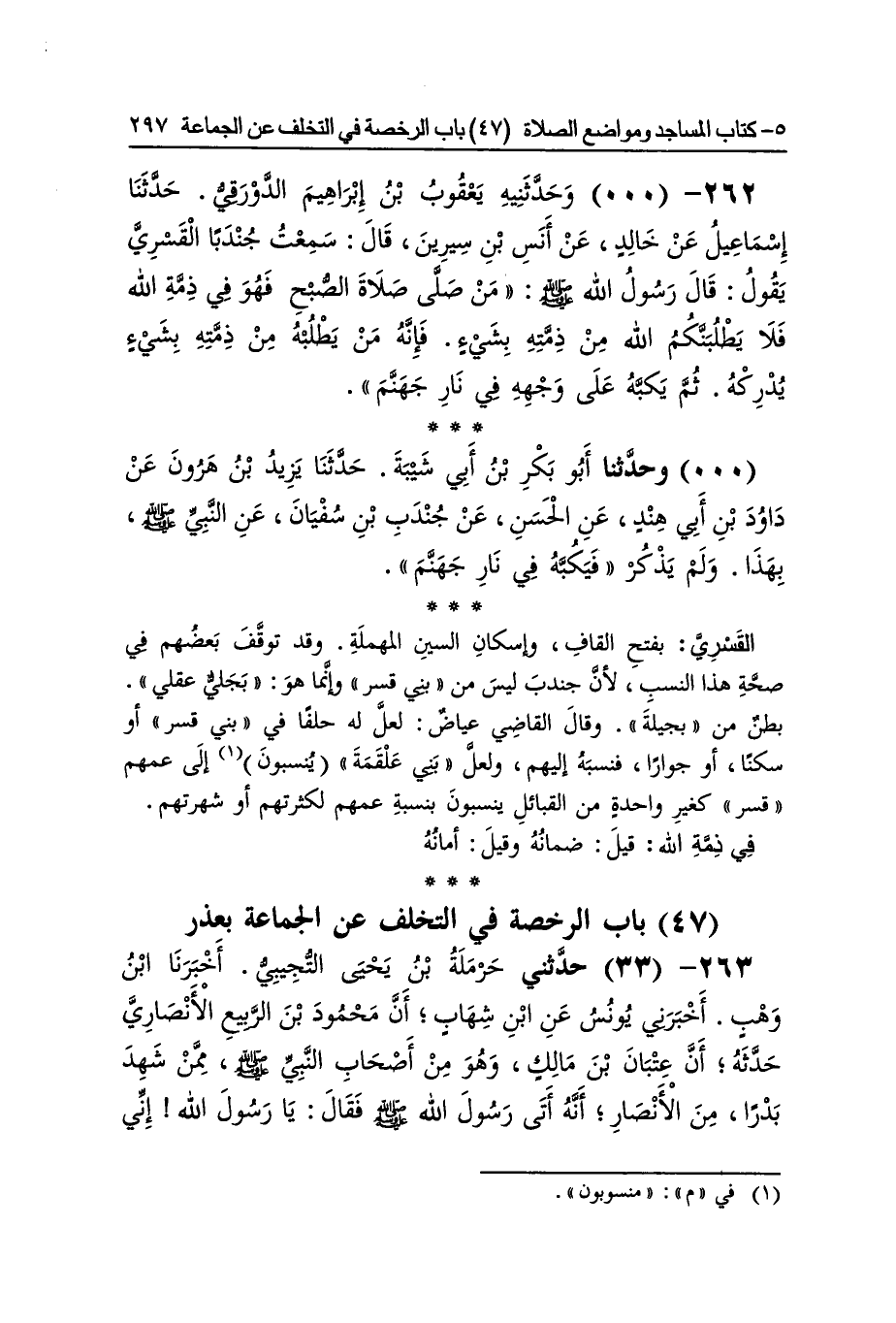 [657] جُنْدُب بن سُفْيَان هُوَ جُنْدُب بن عبد الله ينْسب تَارَة إِلَى أَبِيه وَتارَة إِلَى جده الْقَسرِي بِفَتْح الْقَاف وَإِسْكَان السِّين الْمُهْملَة وَقد توقف بَعضهم فِي صِحَة هَذَا النّسَب لِأَن جُنْدُب لَيْسَ من بني قسر وَإِنَّمَا هُوَ بجلي عَقْلِي بطن من بجيلة وَقَالَ القَاضِي عِيَاض لَعَلَّ لَهُ حلفا فِي بني قسر أَو سكنا أَو جوارا فنسبه إِلَيْهِم وَلَعَلَّ بني عَلْقَمَة ينسبون إِلَى عمهم قسر كَغَيْر وَاحِدَة من الْقَبَائِل ينسبون بِنِسْبَة عمهم لكثرتهم أَو شهرتهم فِي ذمَّة الله قيل ضَمَانه وَقيل أَمَانه