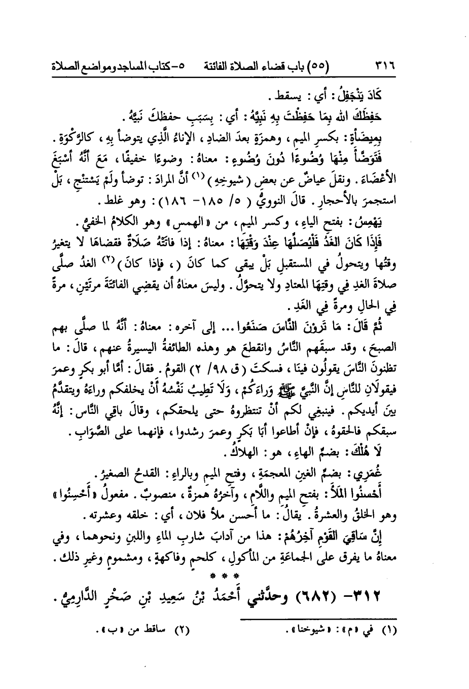 [681] عبد الله بن رَبَاح بِفَتْح الرَّاء وباء مُوَحدَة لَا يلوي لَا يعْطف أبهار اللَّيْل بِالْمُوَحَّدَةِ وَتَشْديد الرَّاء أَي انتصف فنعس بِفَتْح الْعين وَالنُّعَاس مُقَدّمَة النّوم وَهُوَ ريح لَطِيفَة تَأتي من قبل الدِّمَاغ يُغطي على الْعين وَلَا تصل الْقلب فَإِذا وصلت الْقلب كَانَت نوما فدعمته أَي أَقمت ميله عَن النّوم وصرت تَحْتَهُ كالدعامة للْبِنَاء فَوْقهَا تهور اللَّيْل أَي ذهب أَكْثَره مَأْخُوذ من تهور الْبناء وَهُوَ انهدامه كَاد ينجفل أَي يسْقط حفظك الله بِمَا حفظت بِهِ نبيه أَي بِسَبَب حفظك نبيه بميضأة بِكَسْر الْمِيم وهمزة بعد الضَّاد الْإِنَاء الَّذِي يتَوَضَّأ بِهِ كالركوة فَتَوَضَّأ مِنْهَا وضُوءًا دون وضوء مَعْنَاهُ وضُوءًا خَفِيفا مَعَ أَنه أَسْبغ الْأَعْضَاء وَنقل عِيَاض عَن بعض شُيُوخه أَن المُرَاد تَوَضَّأ وَلم يسْتَنْج بل استجمر بالأحجار قَالَ النَّوَوِيّ وَهُوَ غلط يهمس بِفَتْح الْيَاء وَكسر الْمِيم من الهمس وَهُوَ الْكَلَام الْخَفي فَإِذا كَانَ الْغَد فليصلها عِنْد وَقتهَا مَعْنَاهُ إِذا فَاتَتْهُ صَلَاة فقضاها لَا يتَغَيَّر وَقتهَا ويتحول فِي الْمُسْتَقْبل بل يبْقى كَمَا كَانَ فَإِذا كَانَ الْغَد صلى صَلَاة الْغَد فِي وَقتهَا الْمُعْتَاد وَلَا يتَحَوَّل وَلَيْسَ مَعْنَاهُ أَن يقْضِي الْفَائِتَة مرَّتَيْنِ مرّة فِي الْحَال وَمرَّة فِي الْغَد ثمَّ قَالَ مَا ترَوْنَ النَّاس صَنَعُوا إِلَى آخِره مَعْنَاهُ أَنه لما صلى بهم الصُّبْح وَقد سبقهمْ النَّاس وَانْقطع هُوَ وَهَذِه الطَّائِفَة الْيَسِيرَة عَنْهُم قَالَ مَا تظنون النَّاس يَقُولُونَ فِينَا فَسكت الْقَوْم فَقَالَ أما أَبُو بكر وَعمر فَيَقُولَانِ للنَّاس إِن النَّبِي صلى الله عَلَيْهِ وَسلم وراءكم وَلَا تطيب نَفسه أَن يخلفكم وَرَاءه ويتقدم بَين أَيْدِيكُم فَيَنْبَغِي لكم أَن تنتظروه حَتَّى يلحقكم وَقَالَ بَاقِي النَّاس إِنَّه سبقكم فالحقوه فَإِن أطاعوا أَبَا بكر وَعمر رشدوا فَإِنَّهُمَا على الصَّوَاب لَا هلك بِضَم الْهَاء هُوَ الْهَلَاك غمري بِضَم الْغَيْن الْمُعْجَمَة وَفتح الْمِيم وبالراء الْقدح الصَّغِير أَحْسنُوا الْمَلأ بِفَتْح الْمِيم وَاللَّام وَآخره همزَة مَنْصُوب مفعول أَحْسنُوا وَهُوَ الْخلق وَالْعشرَة يُقَال مَا أحسن مَلأ فلَان أَي خلقه وعشرته إِن ساقي الْقَوْم آخِرهم هَذَا من آدَاب شَارِب المَاء وَاللَّبن وَنَحْوهمَا وَفِي مَعْنَاهُ مَا يفرق على الْجَمَاعَة من الْمَأْكُول كلحم وَفَاكِهَة ومشموم وَغير ذَلِك