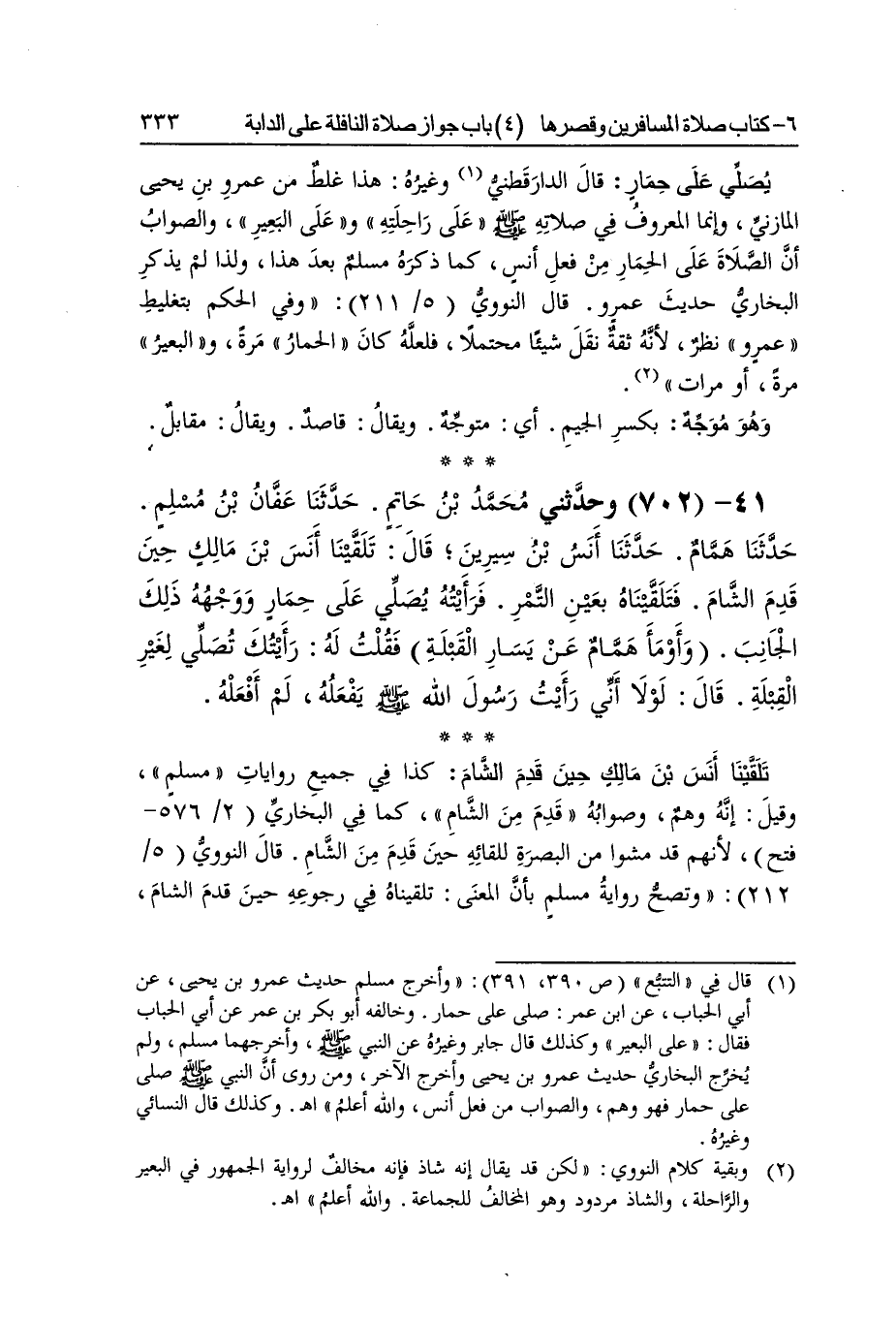 [700] يُصَلِّي على حمَار قَالَ الدَّارَقُطْنِيّ وَغَيره هَذَا غلط من عَمْرو بن يحيى الْمَازِني وَإِنَّمَا الْمَعْرُوف فِي صلَاته صلى الله عَلَيْهِ وَسلم على رَاحِلَته وعَلى الْبَعِير وَالصَّوَاب أَن الصَّلَاة على الْحمار من فعل أنس كَمَا ذكره مُسلم بعد هَذَا وَلذَا لم يذكر البُخَارِيّ حَدِيث عَمْرو قَالَ النَّوَوِيّ وَفِي الحكم بتغليظ عَمْرو نظر لِأَنَّهُ ثِقَة نقل الشَّيْء مُحْتملا فَلَعَلَّهُ كَانَ الْحمار مرّة وَالْبَعِير مرّة أَو مَرَّات وَهُوَ موجه بِكَسْر الْجِيم أَي مُتَوَجّه وَيُقَال قَاصد وَيُقَال مُقَابل